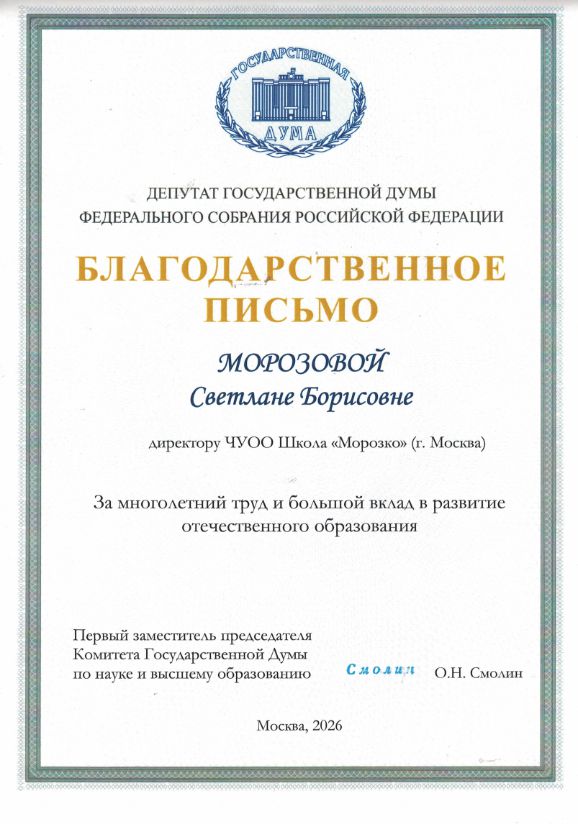 Комитета Гос.Думы по науке и высшему образованию Смолиным О.Н. «ЗА МНОГОЛЕТНИЙ И БОЛЬШОЙ ВКЛАД В РАЗВИТИЕ ОТЕЧЕСТВЕННОГО ОБРАЗОВАНИЯ».