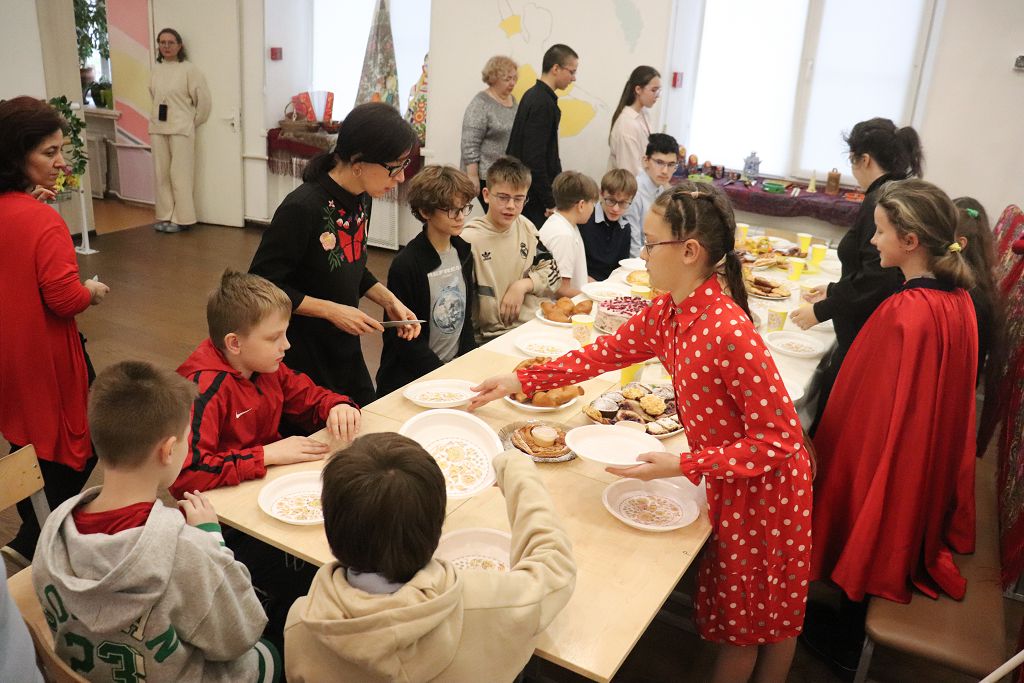 Ребята познакомились еще и с традициями трапезы, поведением за столом, как это принято было в нашей стране с незапамятных времен. А в православной культуре России к столу относились, как к святыне. В сознании православного человека стол всегда связывался с престолом Божьим в церкви. При переходе в новый дом первый из мебели всегда вносили стол и ставили его в переднем, святом углу, где располагались иконы. Это место считалось самым почетным: здесь усаживался хозяин или самый уважаемый гость. Далее за столом рассаживались по старшинству. Перед едой все молились и соблюдали определенные правила, которые нельзя было нарушать. Например, не принято было ругаться за столом. Считалось, что ангел отходит от тех, кто ругается, и горько плачет. Нельзя было громко смеяться, болтать ногами, вести себя неподобающим образом. Есть полагалось чинно, не спеша. Как бы человек не проголодался, он не должен был есть торопливо. Например, нельзя было сидеть за столом в шапке, это считалось верхом неприличия. И никто не начинал есть раньше хозяина. Выходили из-за стола тоже с молитвой и со ловами благодарности Богу за трапезу.