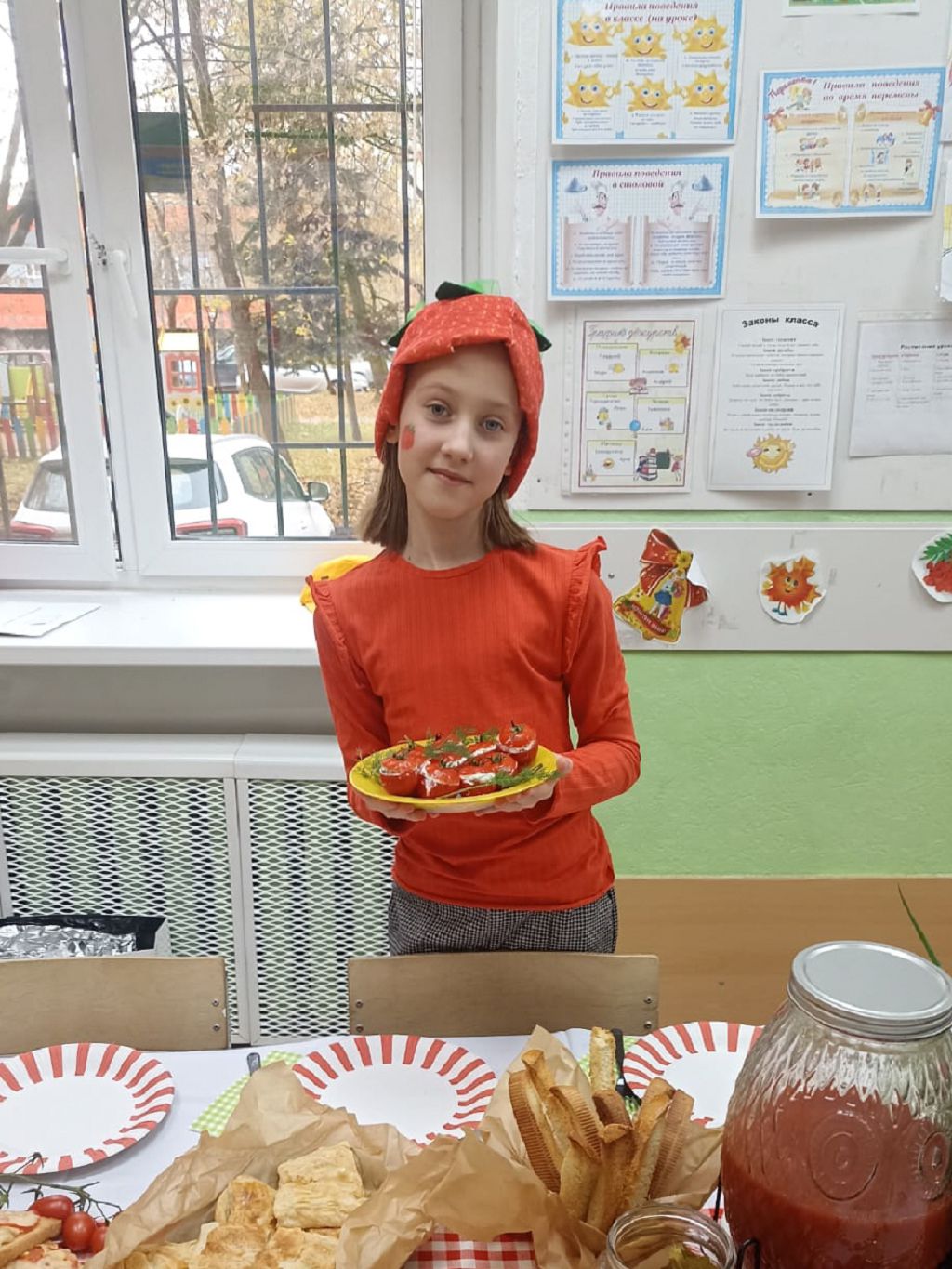 Каждый класс на празднике был одет в соответствии с цветом овоща ( или фрукта), который ребята презентовали. «Морковки» были одеты в яркие оранжевые майки, «помидорки» - в красные рубашки, шапочки и платьица. У «клюковок» были одеты милые бардовые шапочки и шарфики.