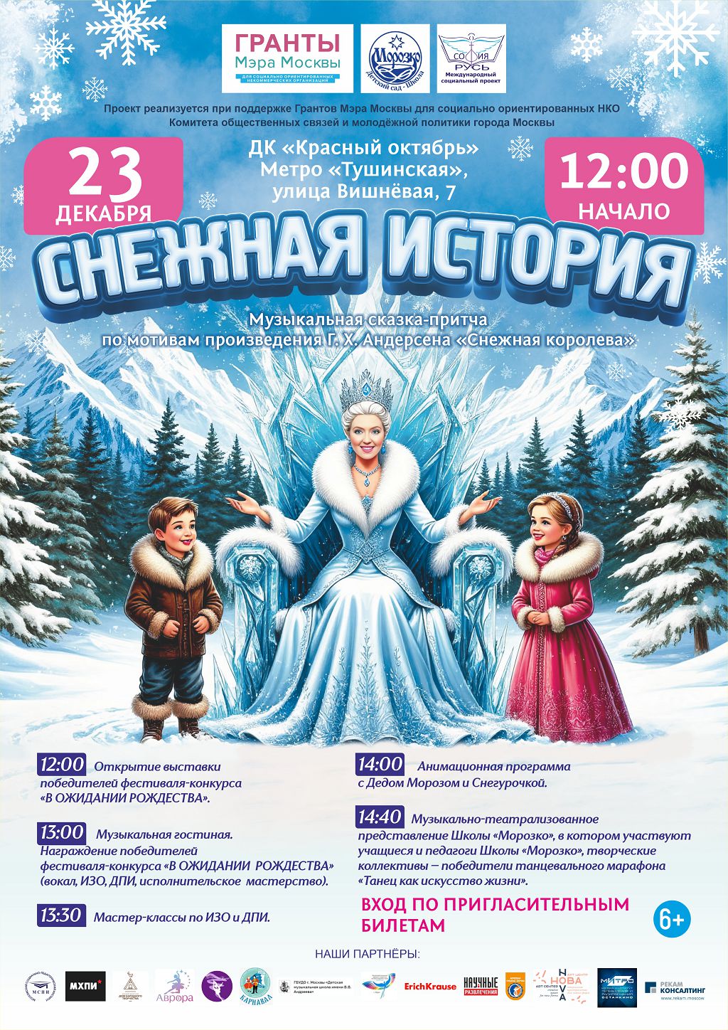 После музыкальной гостиной и мастер-классов состоялось торжественное награждение победителей фестиваля-конкурса «В ожидании Рождества». Победителям были вручены дипломы и памятные подарки, которые подготовили для ребят спонсоры нашего мероприятия ООО Приор Групп. Затем в фойе началась анимационная, развлекательная программа с Дедом Морозом и Снегурочкой. Наших маленьких гостей встречали волонтеры - студенты Московского Социально- Педагогического Института и Медиа Института «Останкино». Но, конечно, самым ярким и значительным событием дня стала новогодняя сказка, которая была показана на большой сцене Дома Культуры «Красный Октябрь». Режиссер- Куликова Я.А., хореограф-постановщик – Пенькова Т.С. В музыкально-театрализованном представлении «Снежная история» участвовали дети и взрослые – ученики и педагоги Школы «Морозко», профессиональные артисты, вокалисты, танцоры, хореографические коллективы, среди которых - победители Танцевального Марафона «Танец как искусство жизни»: ведущий творческий коллектив города Москвы «Аврора», танцевальная студия «ГАЛАКТИКА».
