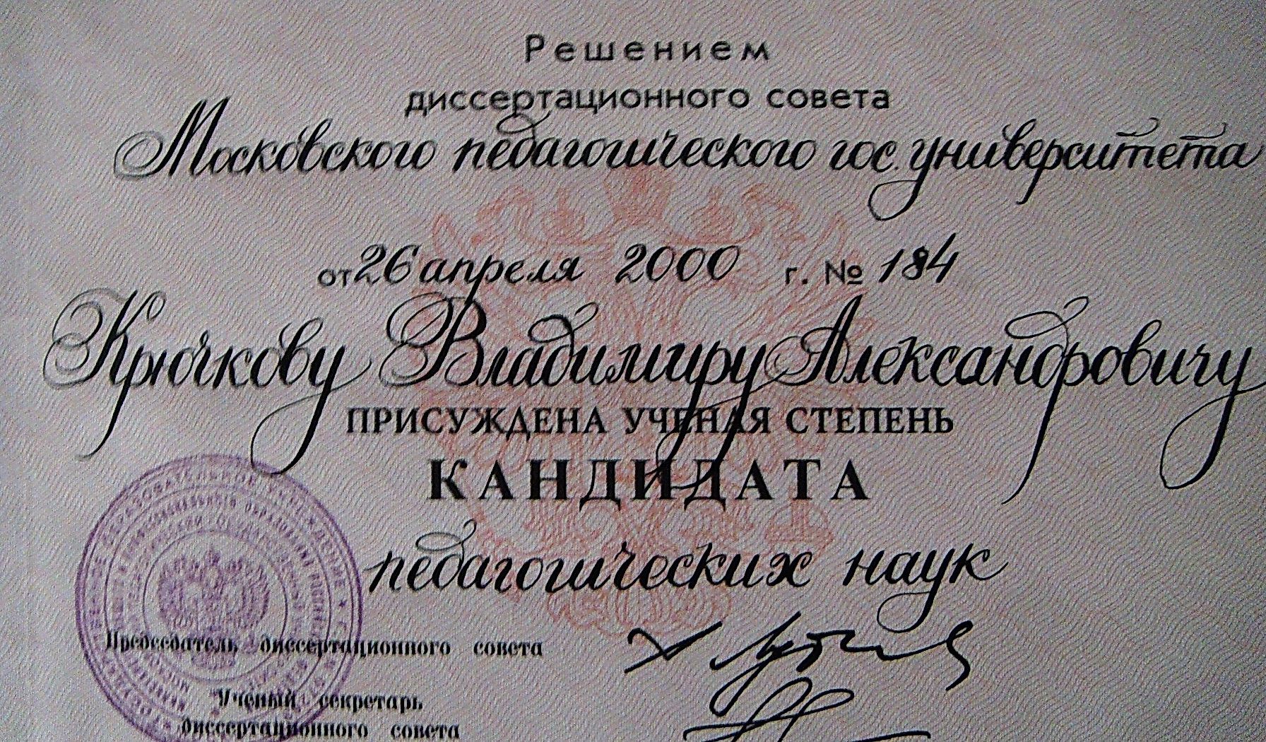 диссертацию на соискание степени кандидата педагогических наук. В 2000 году решением ВАК России присуждена ученная степень "Кандидат педагогических наук".