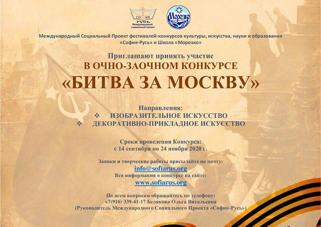 ПОЛОЖЕНИЕ О ПРОВЕДЕНИИ ЗАОЧНОГО (дистанционного) Конкурса изобразительного и декоративно-прикладного искусства «БИТВА ЗА МОСКВУ» Смотреть/скачать.