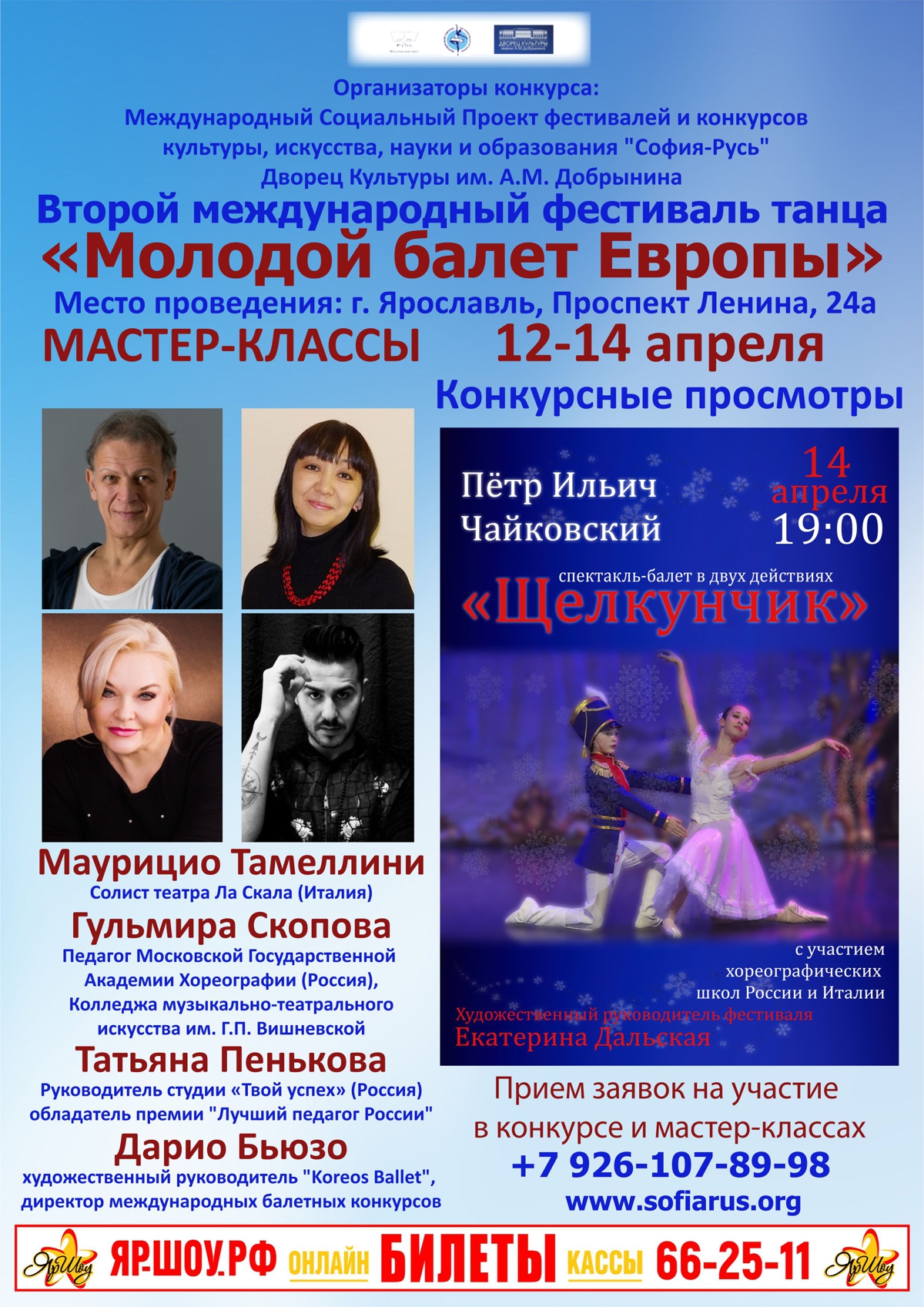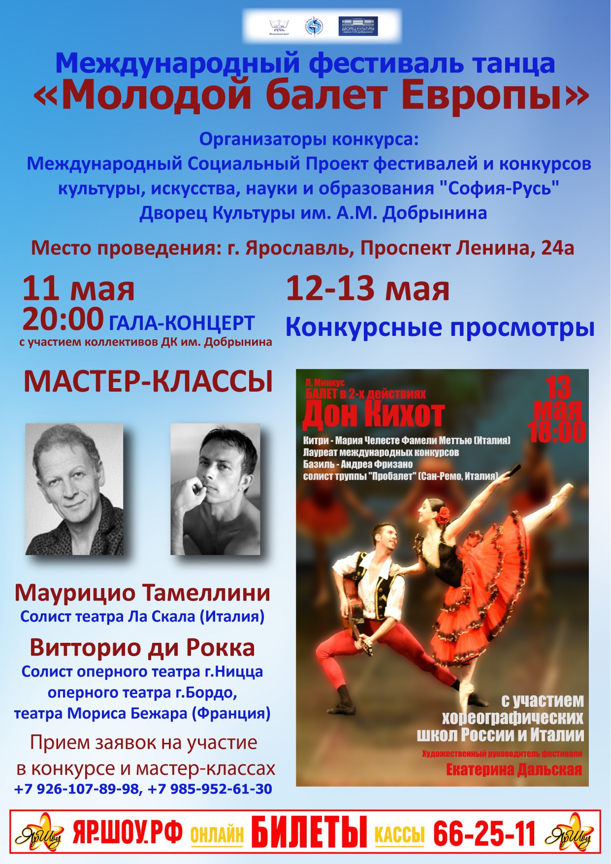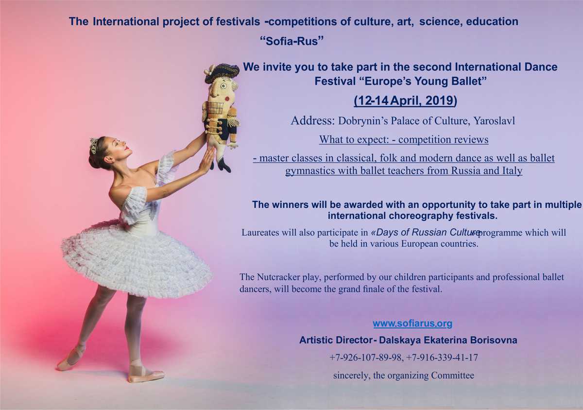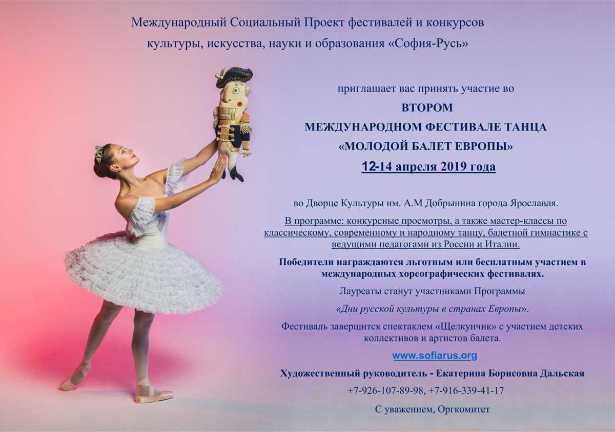 С 11 по 13 мая 2018 года в г. Ярославле во Дворце Культуры им. Добрынина состоялось мероприятие, которое стало настоящим праздником для любителей балета, - Международный Фестиваль Танца «Молодой Балет Европы». Фестиваль танца - часть масштабного Международного Проекта фестивалей и конкурсов культуры, искусства, науки и образования «София-Русь», который проводит мероприятия различной направленности и социальной значимости.