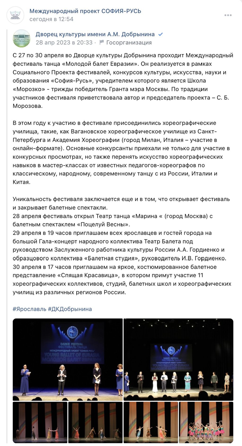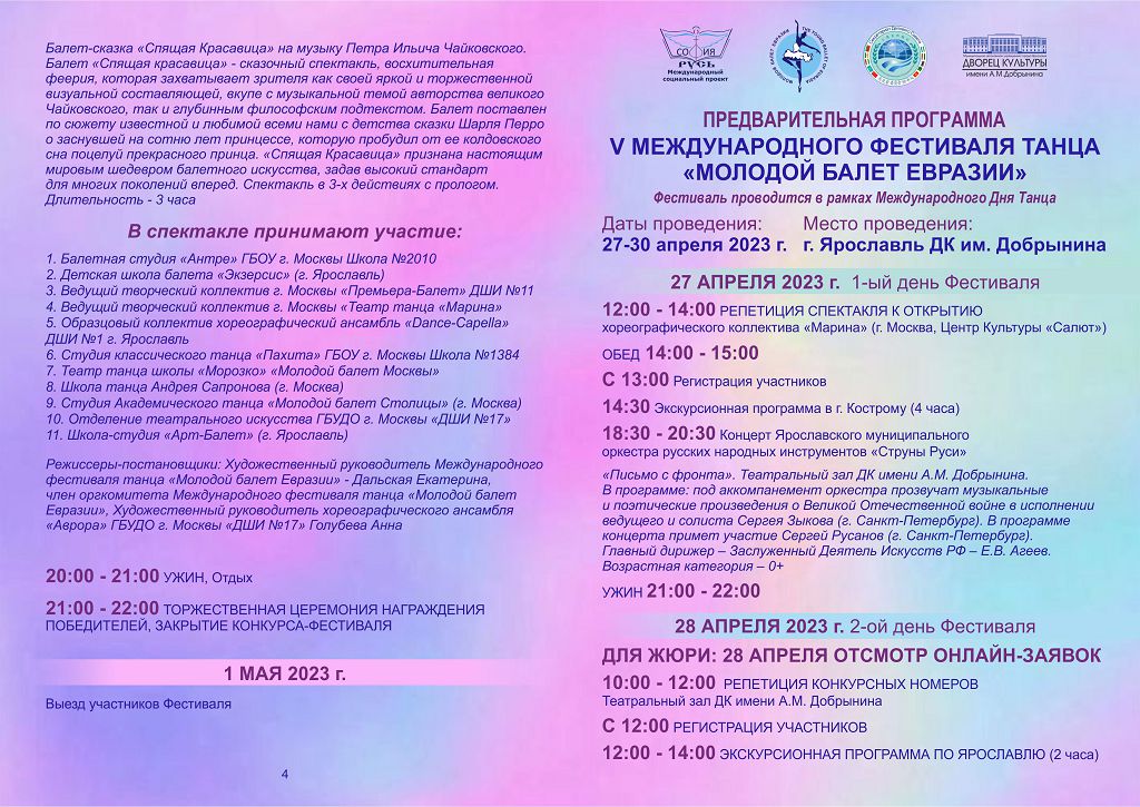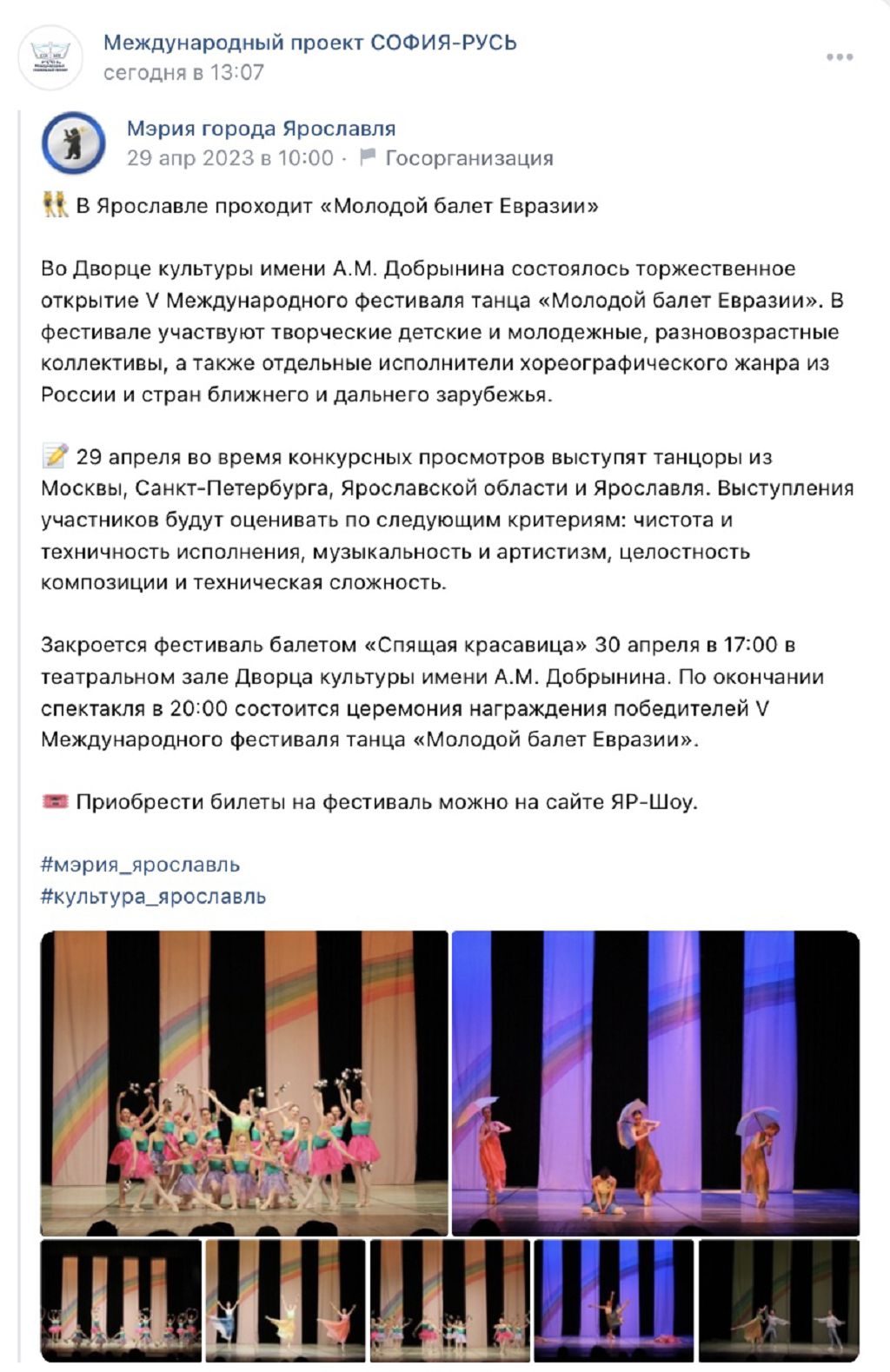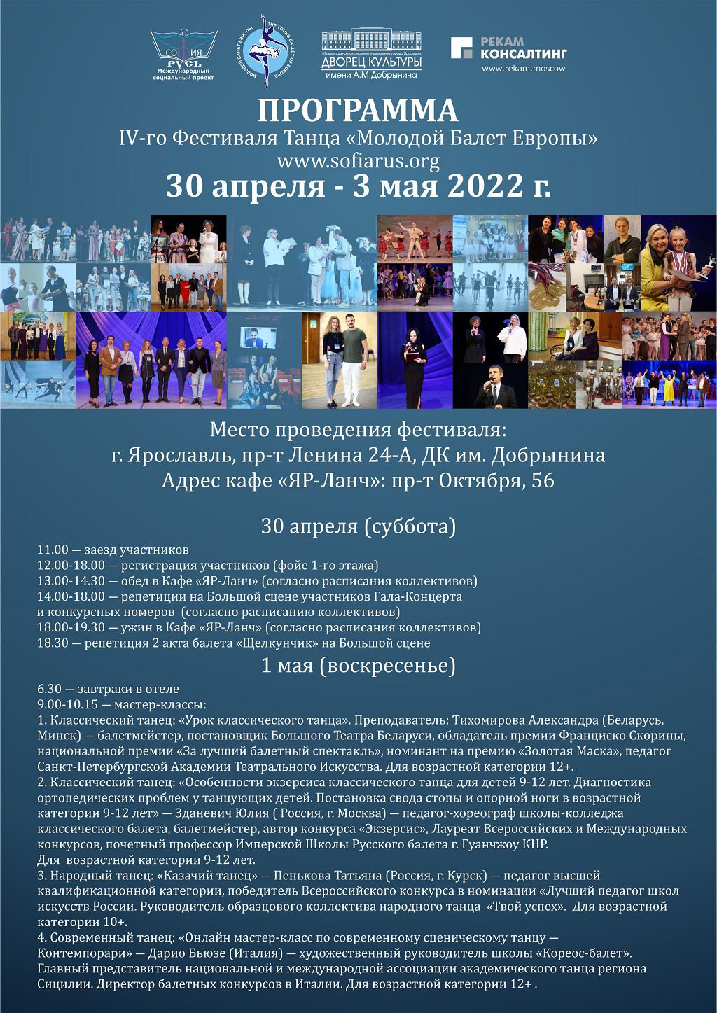 С 11 по 13 мая 2018 года в г. Ярославле во Дворце Культуры им. Добрынина состоялось мероприятие, которое стало настоящим праздником для любителей балета, - Международный Фестиваль Танца «Молодой Балет Европы». Фестиваль танца - часть масштабного Международного Проекта фестивалей и конкурсов культуры, искусства, науки и образования «София-Русь», который проводит мероприятия различной направленности и социальной значимости.