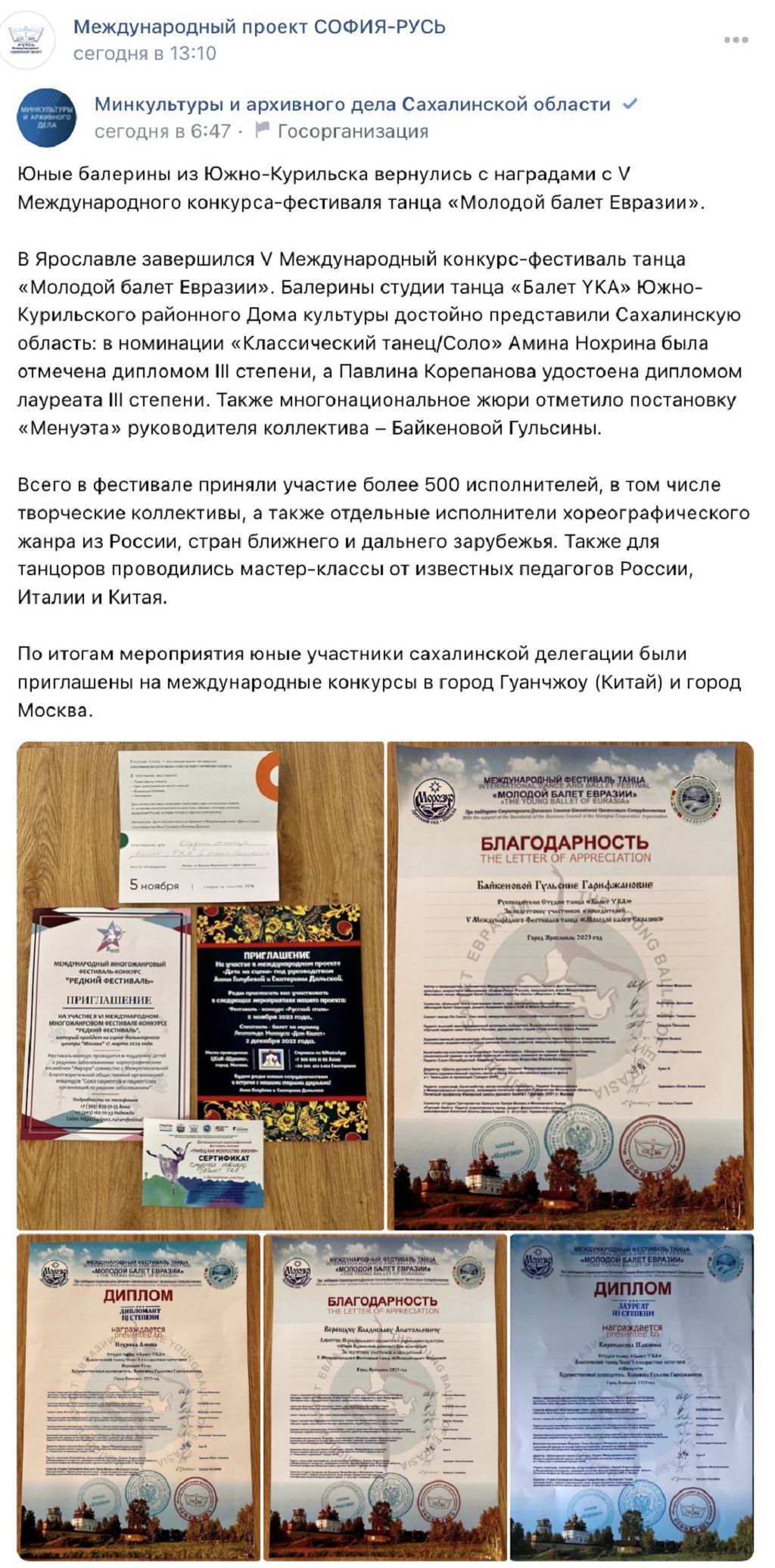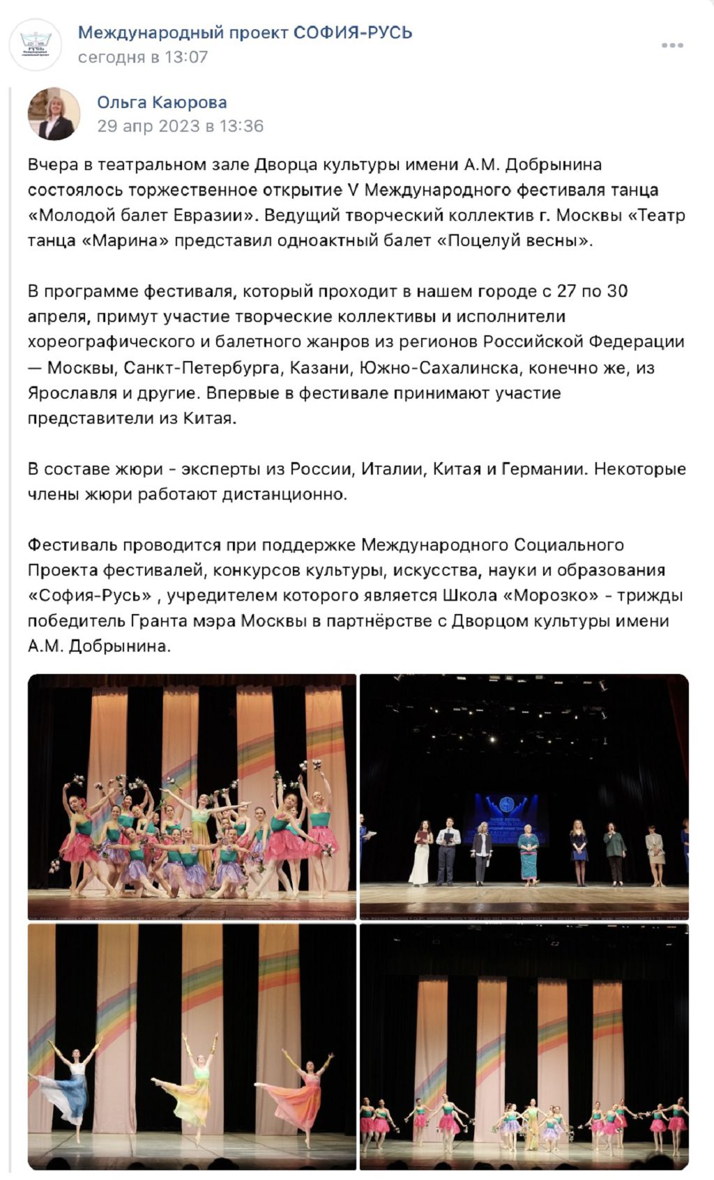 Отдельное спасибо руководителю "Молодой балет Европы" и директору школы "Морозко" Светлане Борисовне Морозовой и худ. руководителю фестиваля "Молодой балет Москвы" Екатерине Борисовне Дальской.