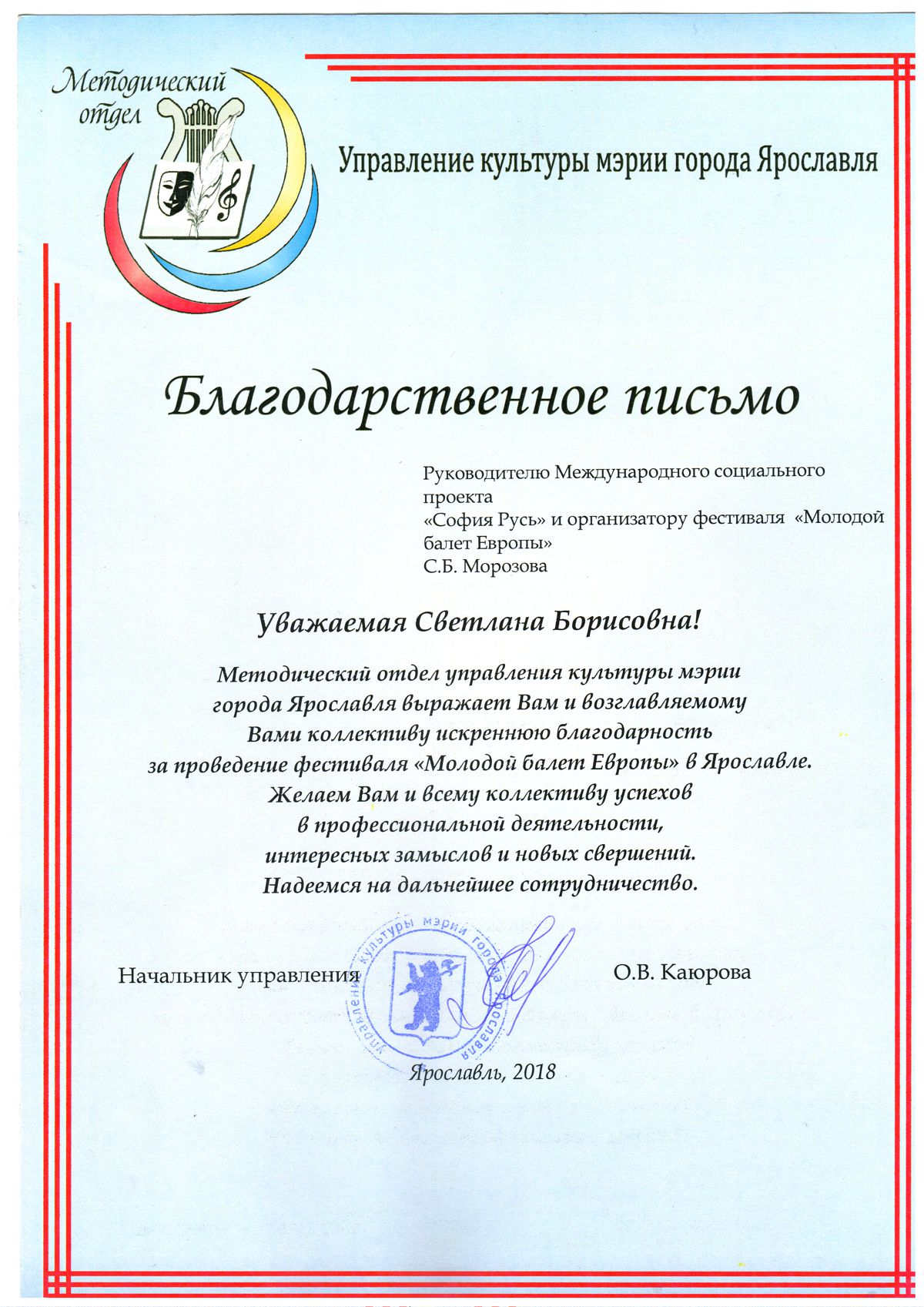«В нашем Дворце культуры состоялся грандиозный и масштабный проект международного уровня! Он объединяет талантливых артистов из Европы и России, и спасибо всем участникам, спасибо, что наши ярославские коллективы было высоко оценены международным жюри , получили много наивысших наград! Мы гордимся, что художественный руководитель балетной студии нашего Дворца Культуры был признан лучшим хореографом-постановщиком! Балет сегодня и в этих стенах всех объединил – детей, педагогов, организаторов. И я очень надеюсь, что данный фестиваль «Молодой балет Европы» проекта «София-Русь» станет ежегодным и получит постоянную прописку на ярославской земле, в моем родном городе Ярославле – столице «Золотого кольца России».