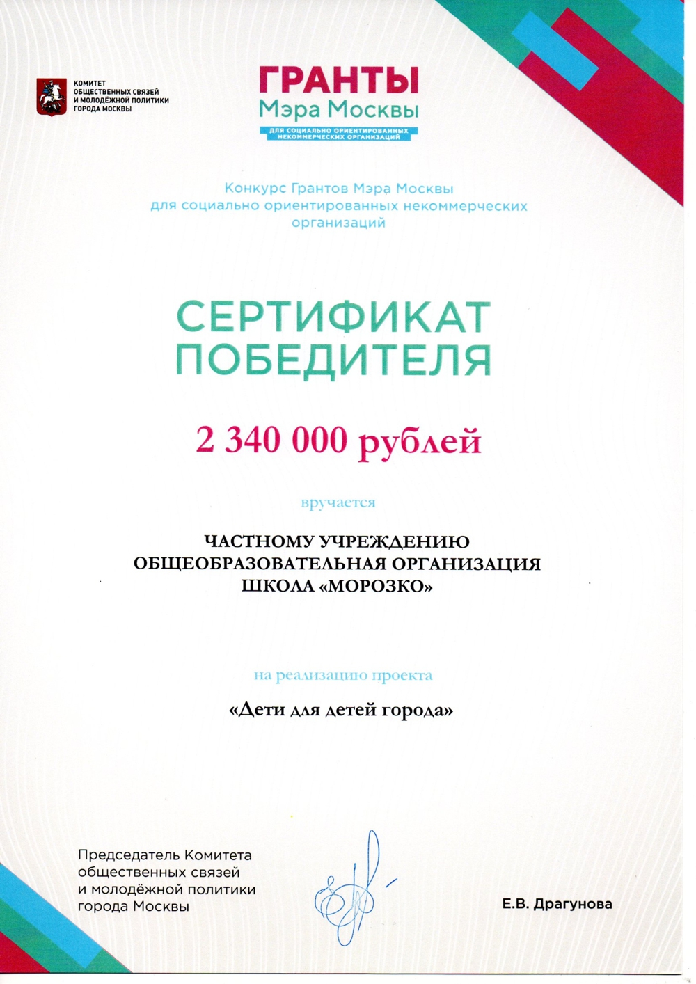 Школа «Морозко» вошла в число победителей грантов Мэра Москвы, как социально ориентированная некоммерческая организация, являющаяся на протяжении ряда лет организатором многочисленных социокультурных, образовательно-просветительских мероприятий, которые наша школа проводит на высоком профессиональном уровне. Проект нашей школы « Дети для детей города» был отмечен, как уникальный, авторский, масштабный, инновационный проект, выходящий за рамки одной образовательной организации. Он рассчитан на детскую и молодежную аудиторию столицы – от дошкольников до студенческой аудитории, охватывая в том числе и подопечных благотворительных фондов – детей из многодетных семей , детей-инвалидов, детей из социально-незащищенных слоев населения. Школа имеет многочисленных партнеров, которых активно привлекает к проведению культурных мероприятий - детских праздников, музыкально-театрализованных представлений, анимационных тематических программ, фестивалей и конкурсов различных творческих направлений, выставок художественного творчества, концертов, музыкальных гостиных-лекториев, творческих вечеров и встреч с известными деятелями культуры и искусства. Нашими партнерами являются образовательные организации и учреждения культуры Москвы, детские художественные и музыкальные школы, школы искусств, центры досуга , дворцы культуры, творческие коллективы и студии столицы .