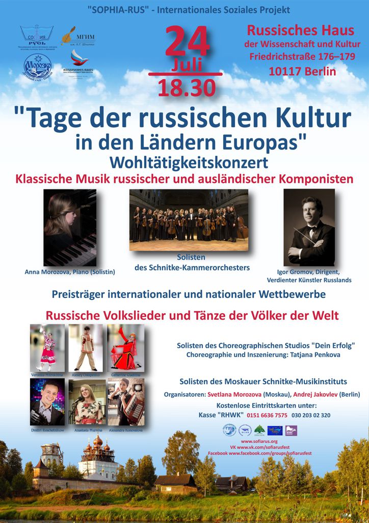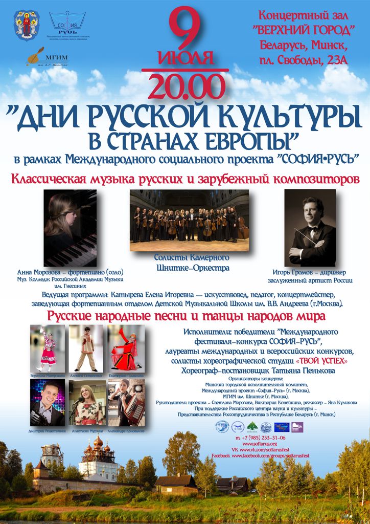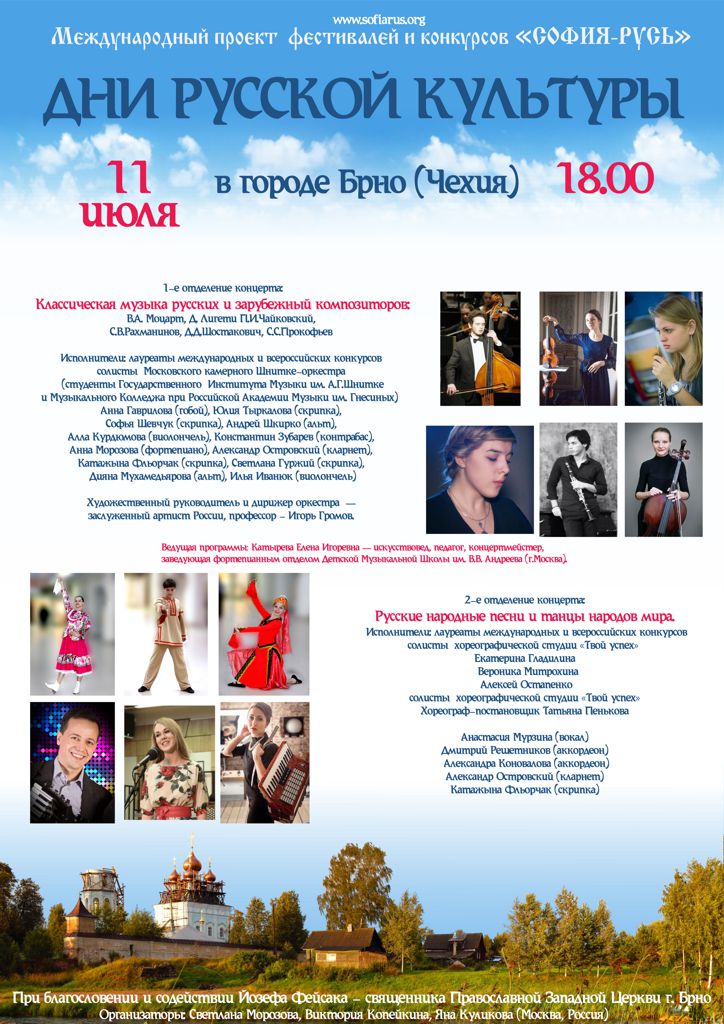 В концертной программе «ДНИ РУССКОЙ КУЛЬТУРЫ в странах Европы» - выступление победителей Международного фестиваля «София-Русь» 2016 года, Лауреатов всероссийских и международных конкурсов, солистов Московского Шнитке – оркестра под руководством дирижера, профессора Игоря Громова, студентов Музыкального колледжа Российской Академии Музыки имени Гнесиных , в исполнении которых прозвучит классическая музыка русских и зарубежных композиторов (скрипка, виолончель, фортепиано, гобой, аккордеон, кларнет, альт, контрабас).