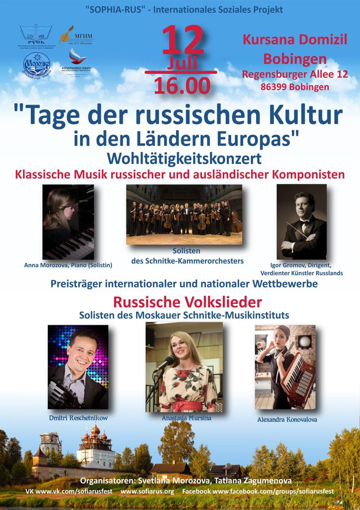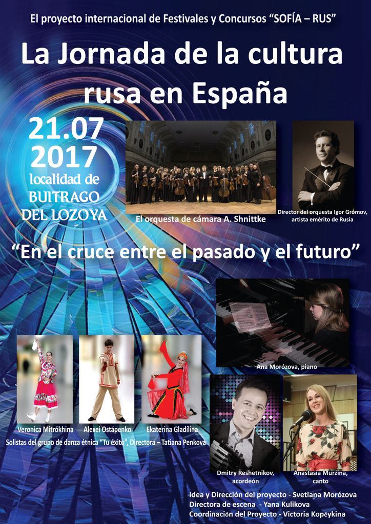 С 9 по 26 июля 2017 г. участники Программы «ДНИ РУССКОЙ КУЛЬТУРЫ в странах Европы» в рамках Международного Социального Проекта «София-Русь» посетят 6 европейских стран. Запланированы концерты в следующих городах: Минск, Концертный зал «Верхний город» (Белоруссия) (Скачать программу концерта), Брно (Чехия) (Скачать программу концерта), Бобинген (Германия) (Скачать программу концерта), Мадрид (Испания), Морато дель Тахунья (Испания), Буйтраго дель Лосойя (Испания), Салоу (Испания), Кришель (Испания), Таррагона (Испания), Фестиваль "Clásicos del Tajuña", Фестиваль "IX Festival de musica de Buitrago del Lozoya Marques Santillana" (Скачать программы выступлений в Испании), Берлин, Российский центр науки и культуры в Берлине (Германия) (Скачать программу концерта).