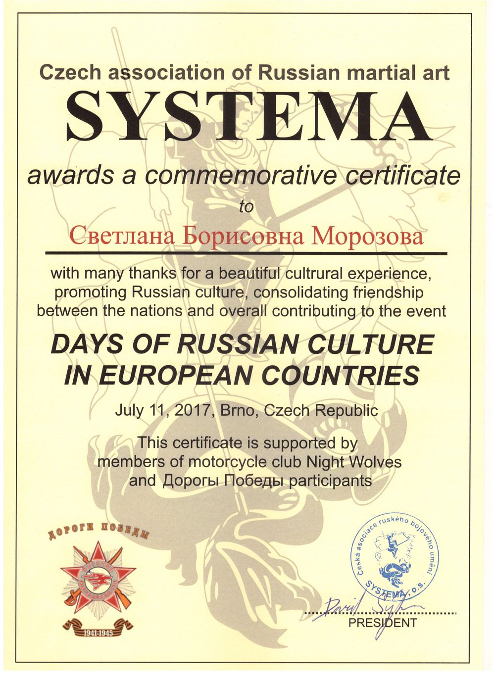 Благодарственное письмо от Чешской ассоциации Русского Боевого Искусства СИСТЕМА. Читать.
