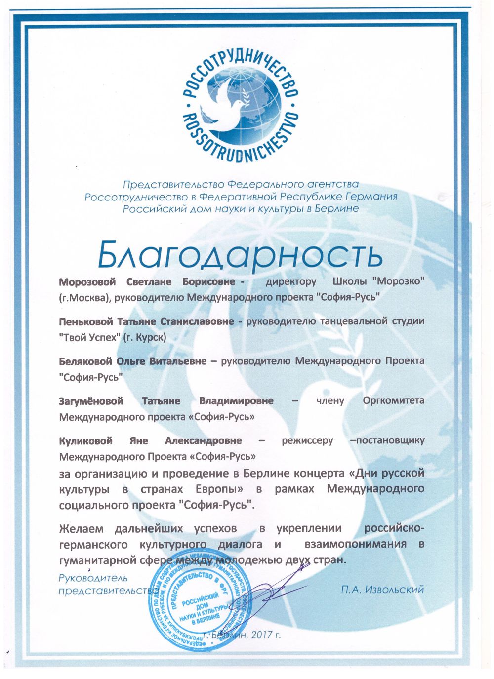 Как руководитель коллектива «Твой успех», который является обладателем Гран-При Всероссийских и Международных конкурсов , а соответственно много участвует в различных фестивалях и мероприятиях, а соответственно знает, какие могут быть "организаторы", хочется выразить всей организационной группе проекта «София-Русь» большую благодарность за их профессионализм и проявленную заботу к каждому участнику проекта!