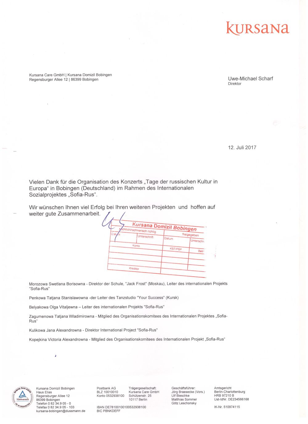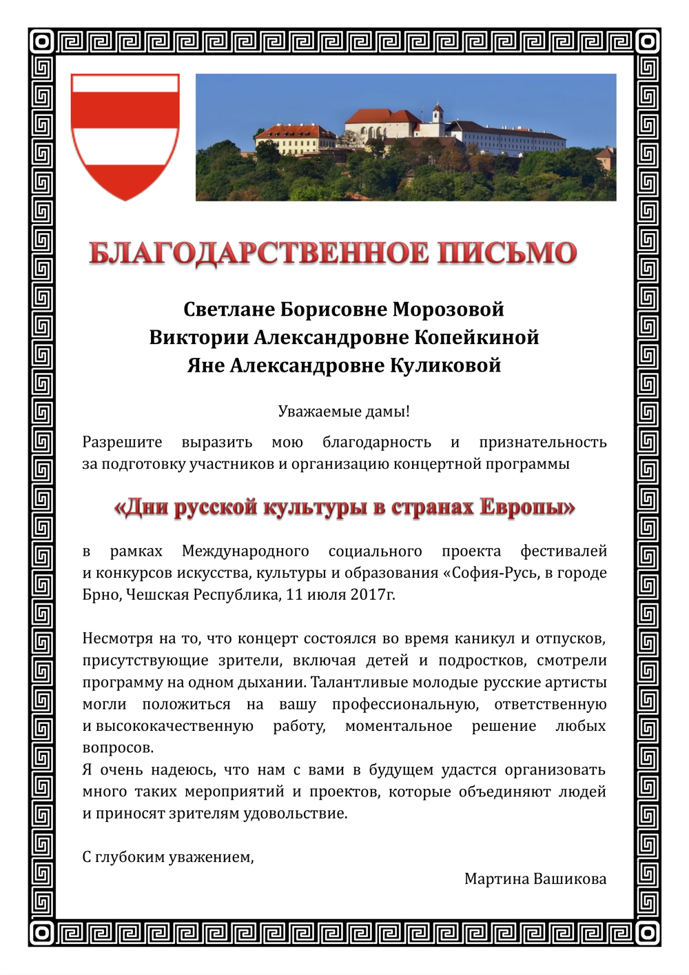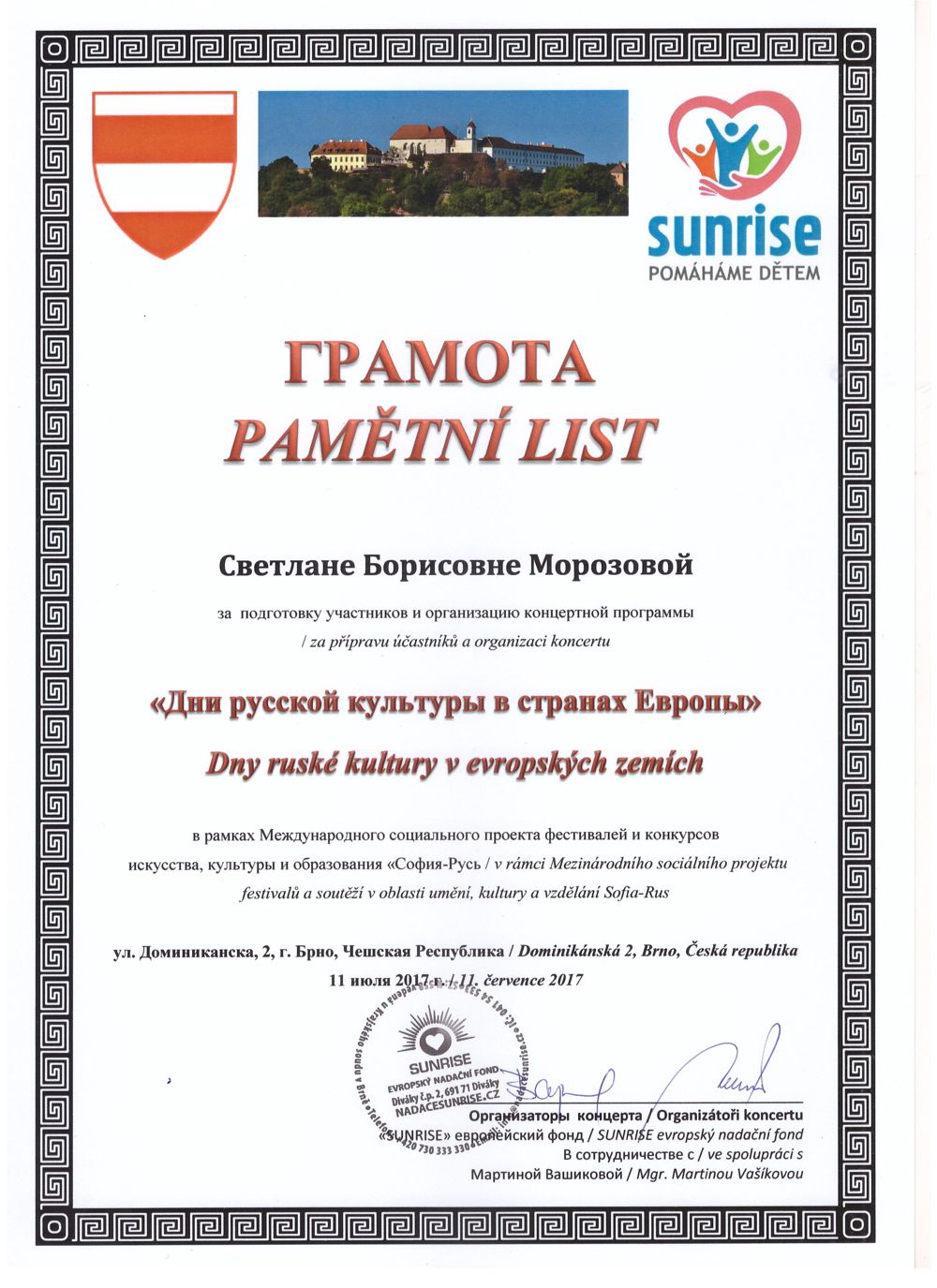 Благодарственное письмо от европейского фонда "SUNRISE" (Чехия). Читать.