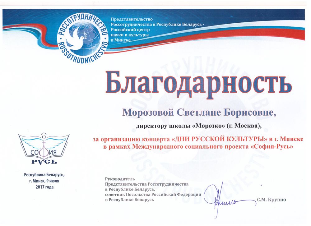 Организаторы Фестиваля культуры и Искусства «СОФИЯ — РУСЬ. ДИАЛОГ КУЛЬТУР» получили благодарственные письма от МОСКОВСКОЙ ГОРОДСКОЙ ДУМЫ.
