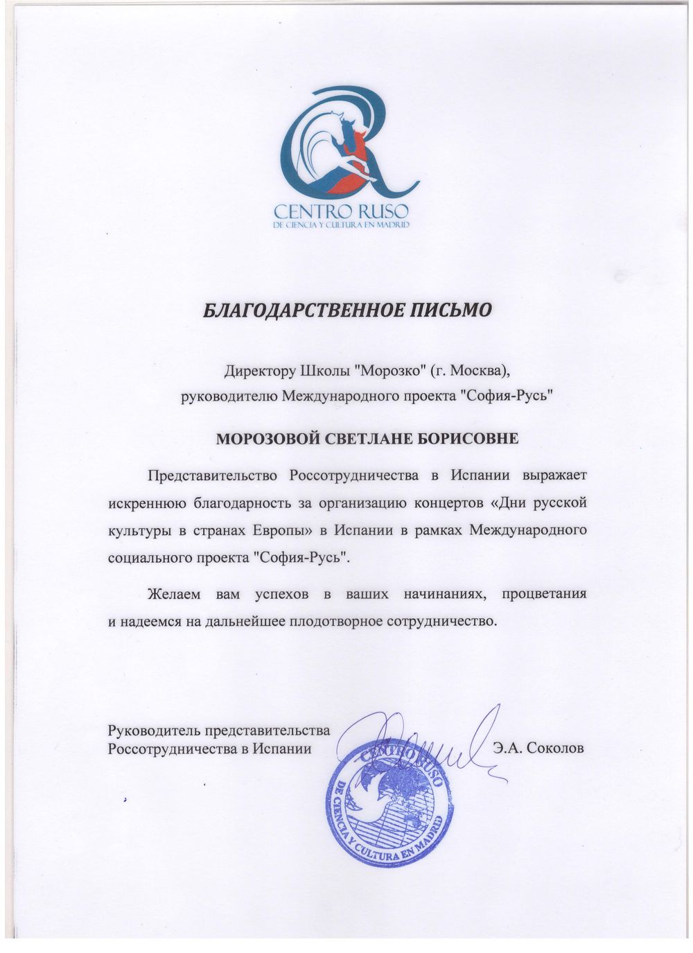 Особенно я хотела бы отметить Ваш высокий профессионализм, который позволил нам вместе организовать целый ряд концертов в рамках Дней российской культуры в Испании на лучших площадках побережья Коста Дорада.