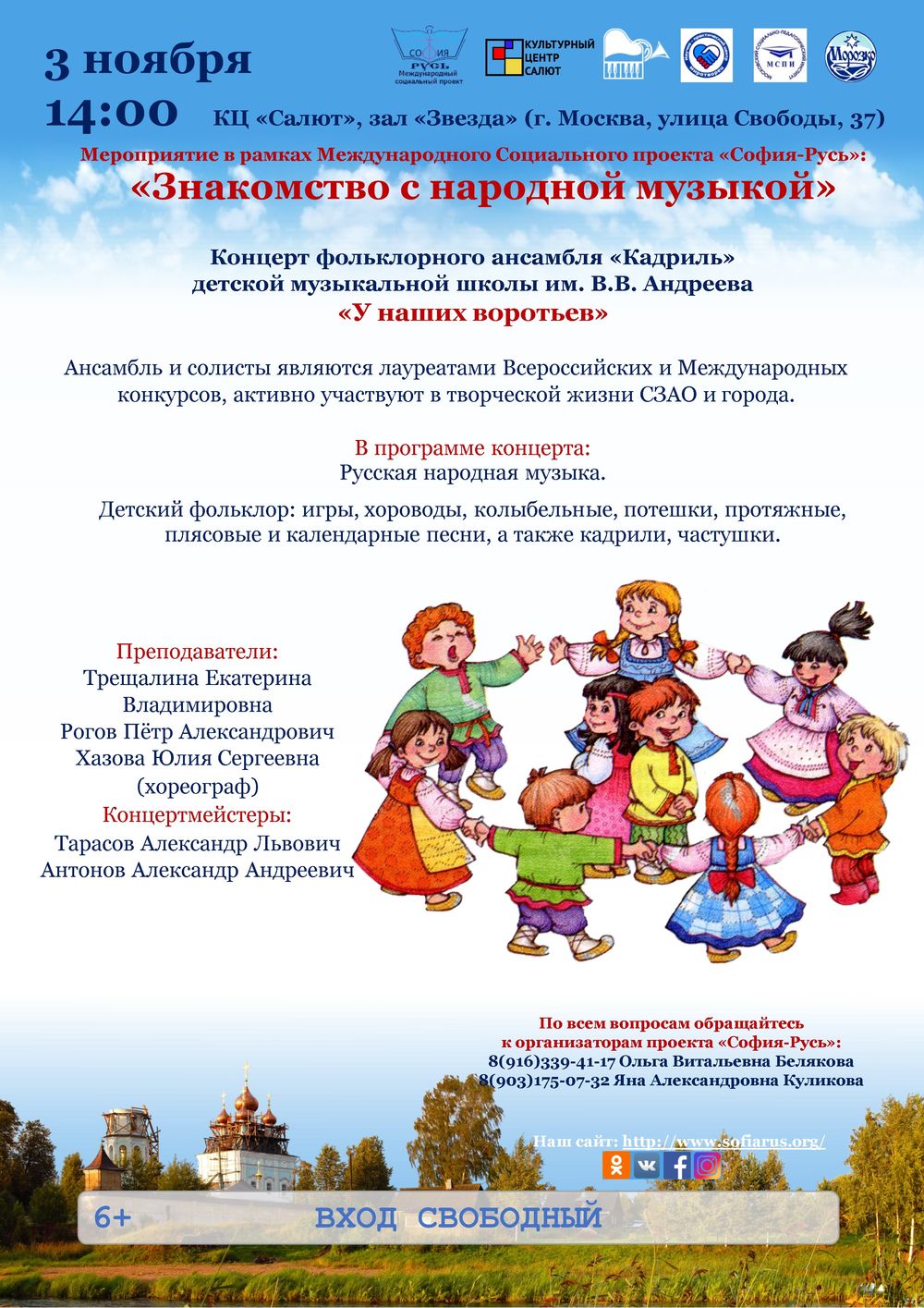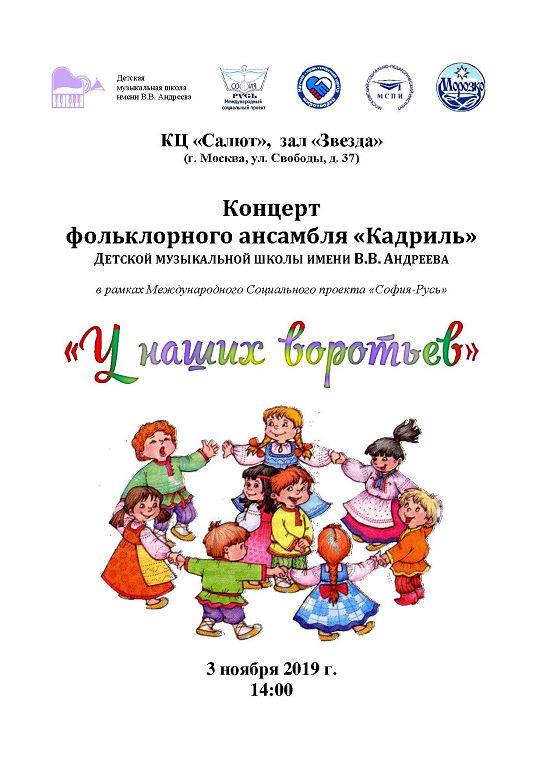 Мероприятие в рамках Международного Социального Проекта «София-Русь»: «Знакомство с народной музыкой» Концерт фольклорного ансамбля «Кадриль» Детской Музыкальной Школы им. В.В. Андреева «У наших воротьев»