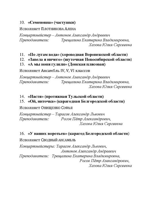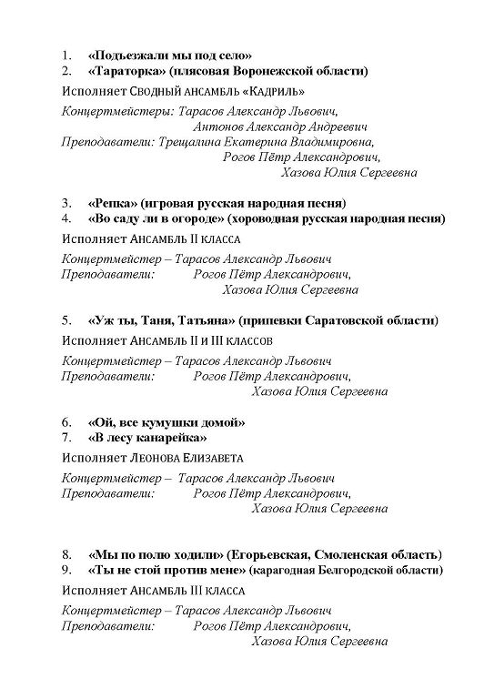 В программе концерта «Знакомство с народной музыкой» фольклорного ансамбля «Кадриль» Детской Музыкальной Школы им. В.В. Андреева прозвучали: