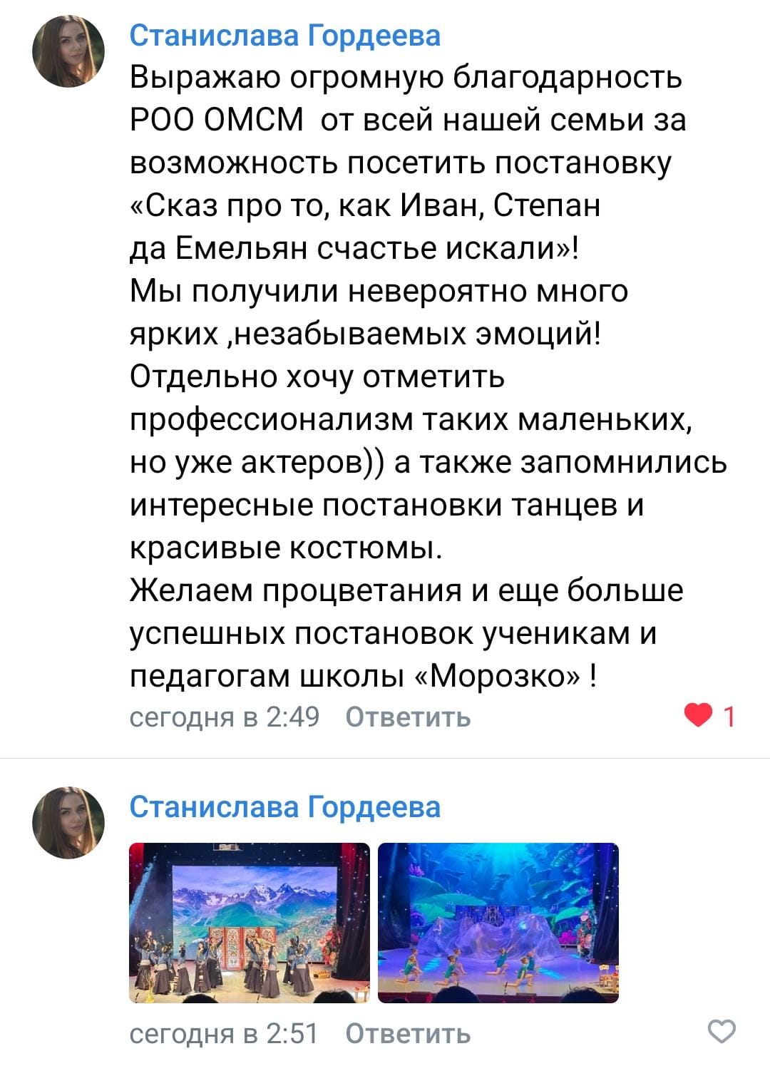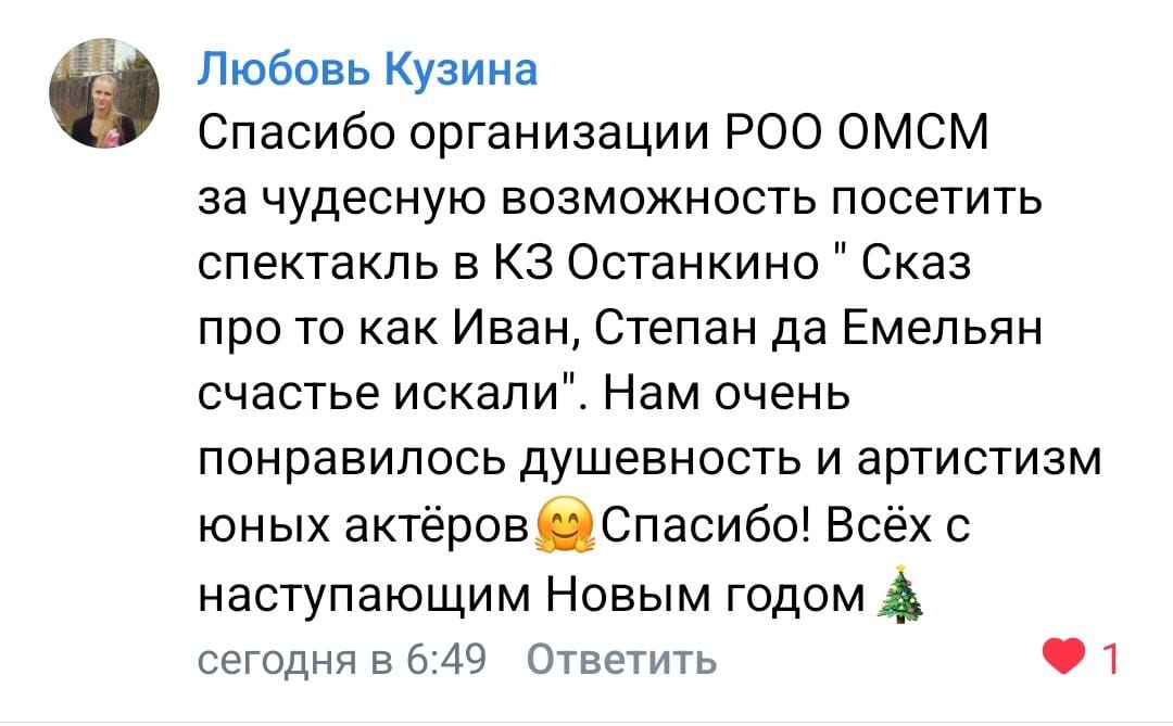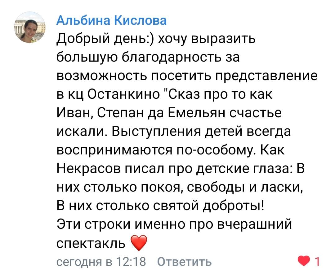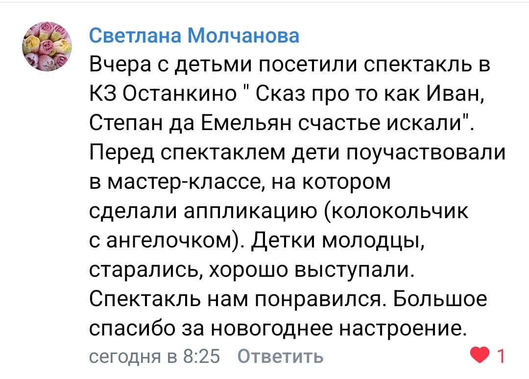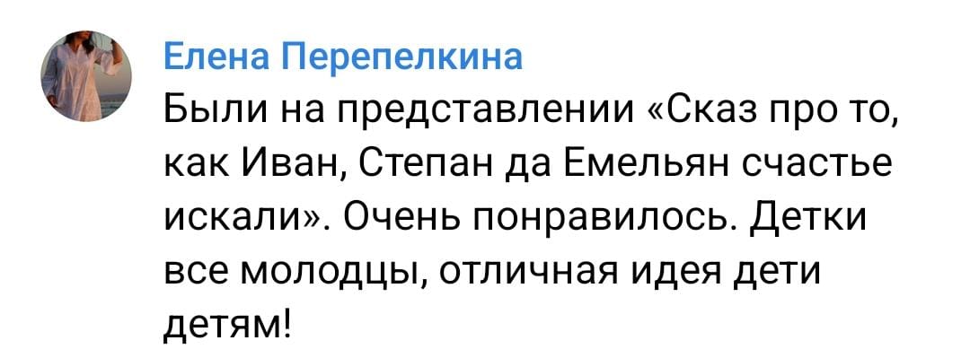 Семья Ильичёвых, выражает благодарность за возможность посетить бесплатно музыкальный спектакль"Сказ про то как Иван, Степан да Емельян счастье искали". Детям очень понравилось, было и весело, захватывающе и в тоже время волшебная, новогодняя атмосфера царила в спектакле. Спасибо за всю организацию🎄🎄🎄🎉🎉🎉