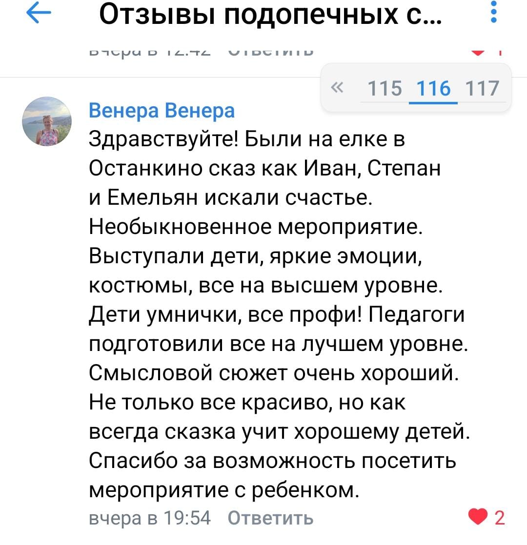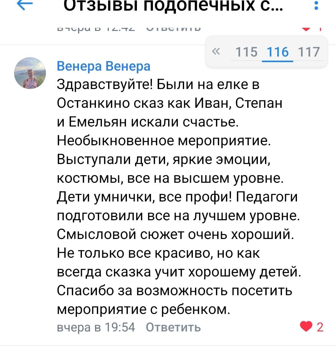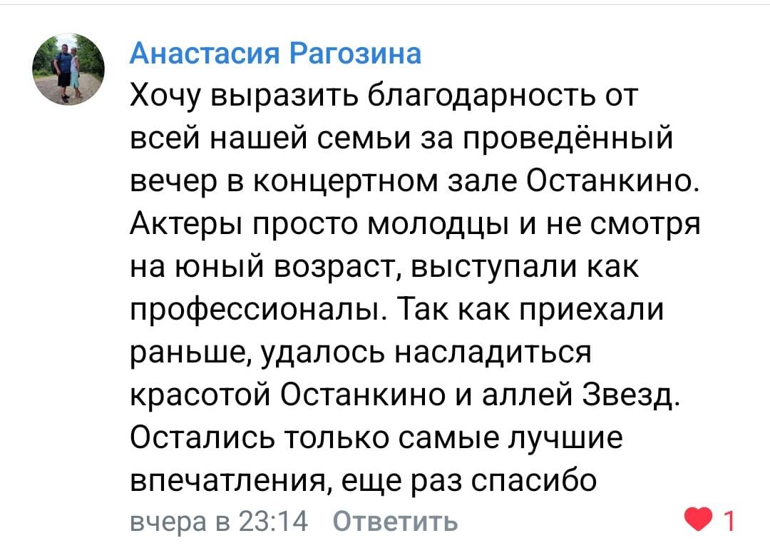 Семья Ильичёвых, выражает благодарность за возможность посетить бесплатно музыкальный спектакль"Сказ про то как Иван, Степан да Емельян счастье искали". Детям очень понравилось, было и весело, захватывающе и в тоже время волшебная, новогодняя атмосфера царила в спектакле. Спасибо за всю организацию🎄🎄🎄🎉🎉🎉