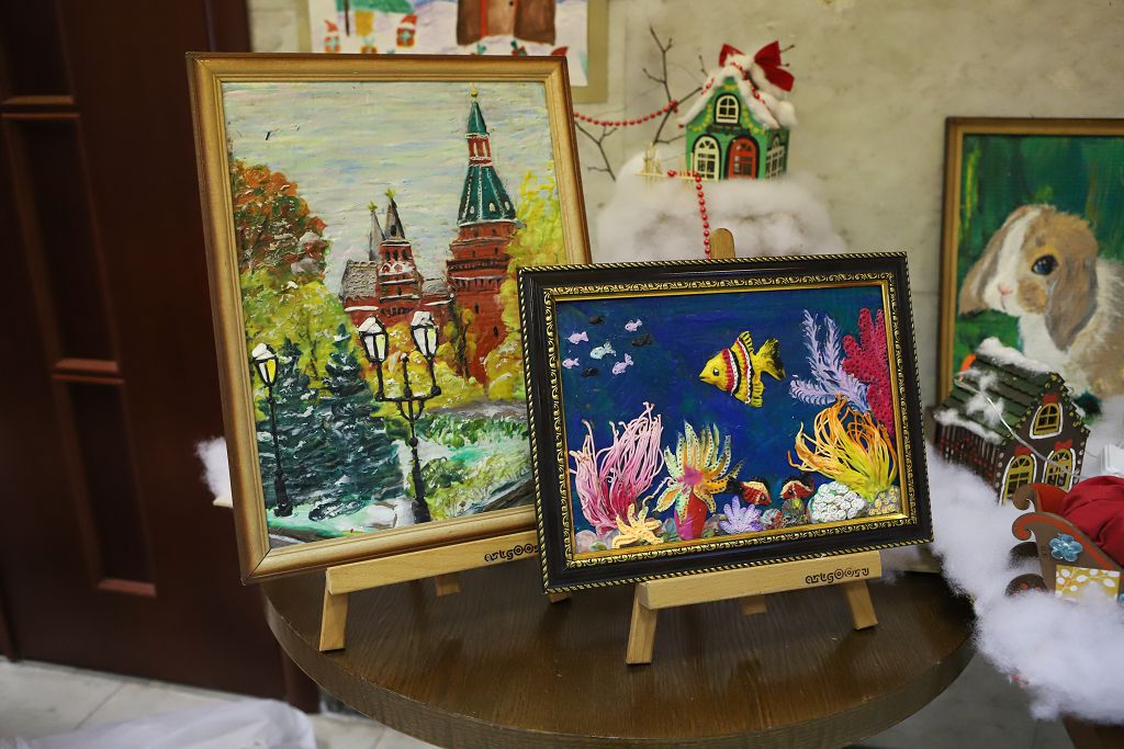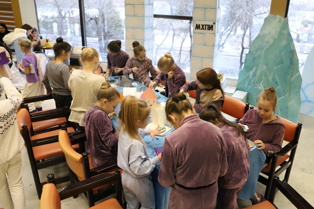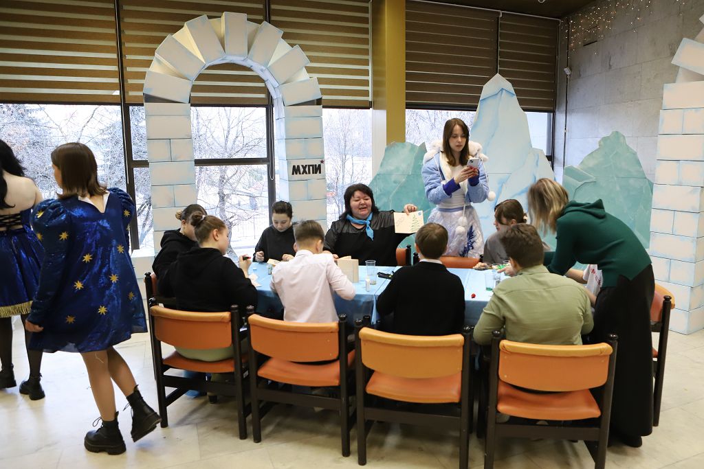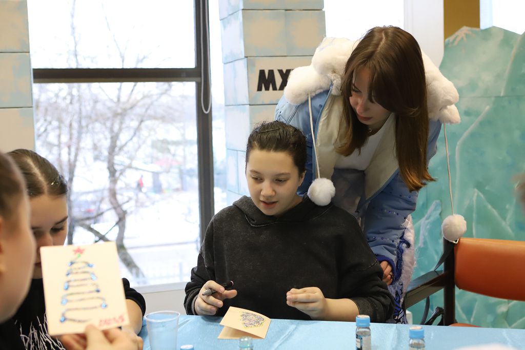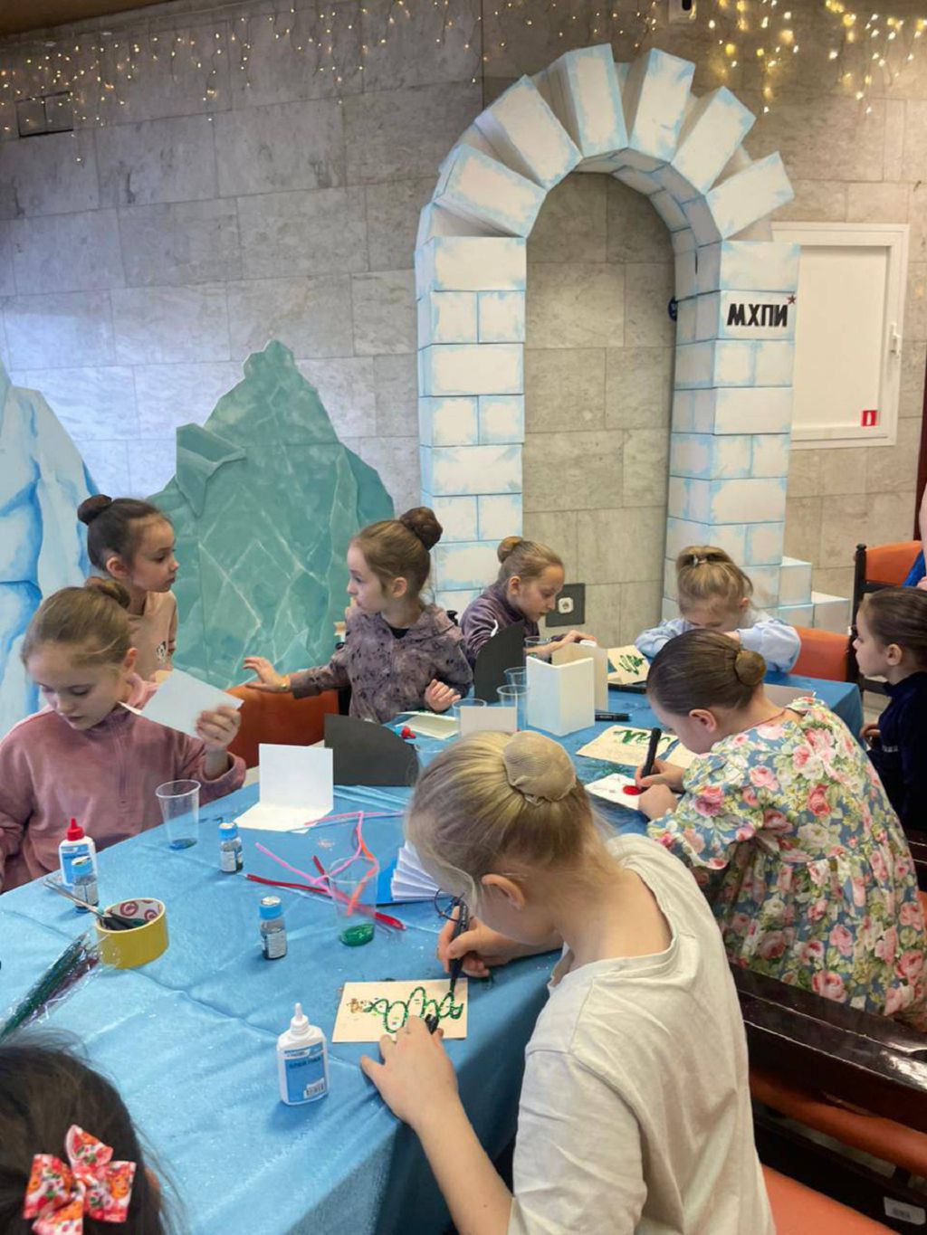 Очень красивую фотозону создали студенты Московского Художественно-Промышленного Института – в виде сказочных, снежных замков. Студенты были одеты в костюмы героев сказок, они не только фотографировали всех желающих, но и провели свои мастер-классы по изготовлению новогодних открыток. Каждый ребенок, посетивший мастер-классы педагогов Школы «Морозко» и студентов МХПИ, унесли с собой новогоднюю открытку, изготовленную своими руками.