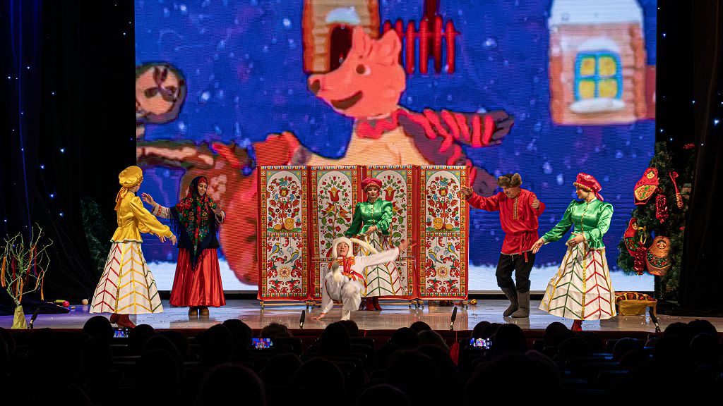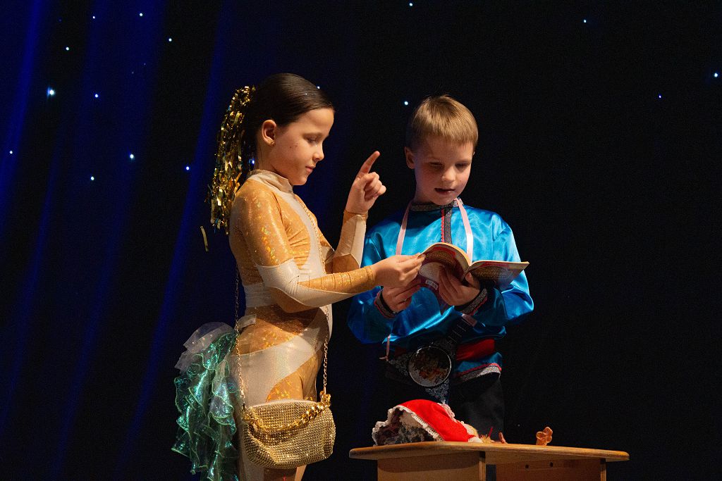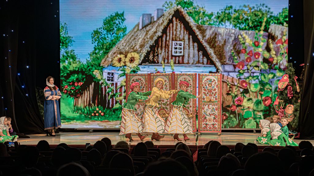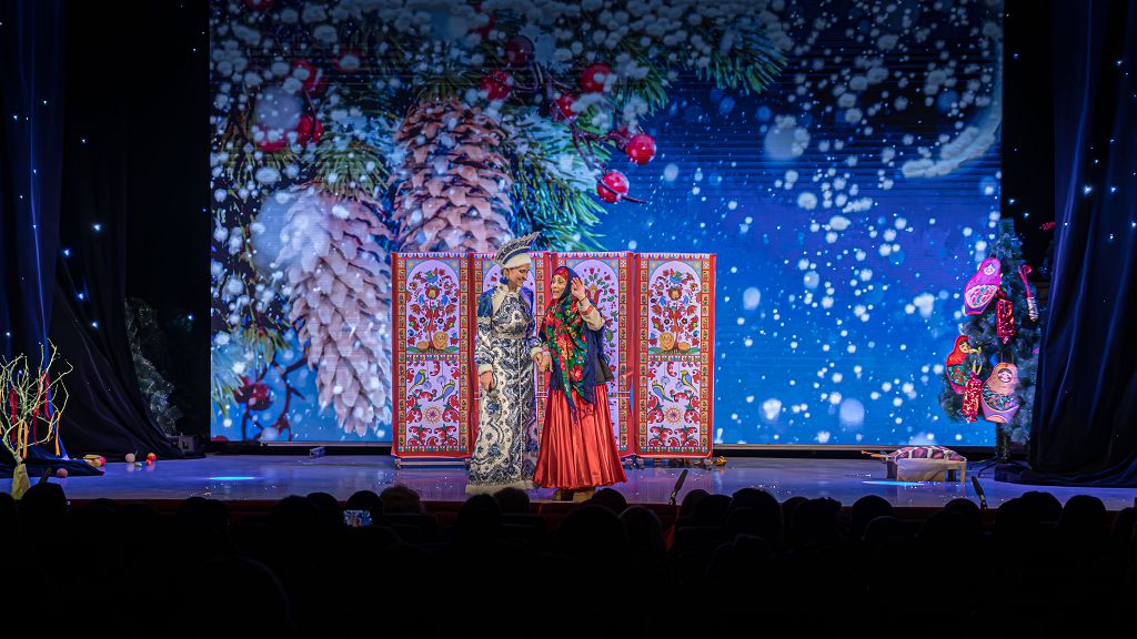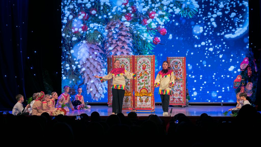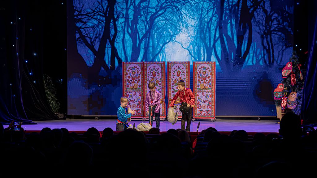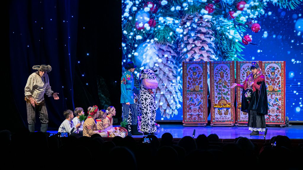 После музыкальной гостиной и награждения победителей все гости были приглашены в Концертный зал, где начался новогодний спектакль «Сказ про то, как Иван, Степан , да Емельян счастье искали». Режиссер- Куликова Я.А., хореограф-постановщик – Пенькова Т.С.
