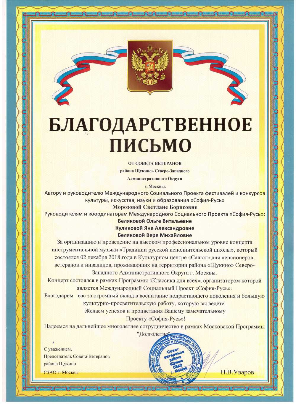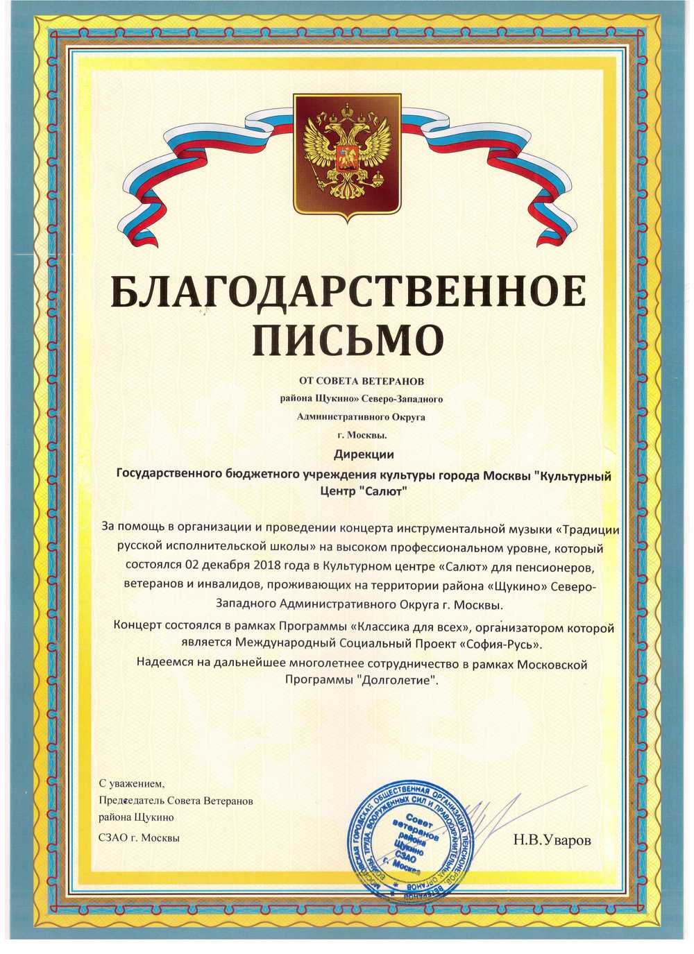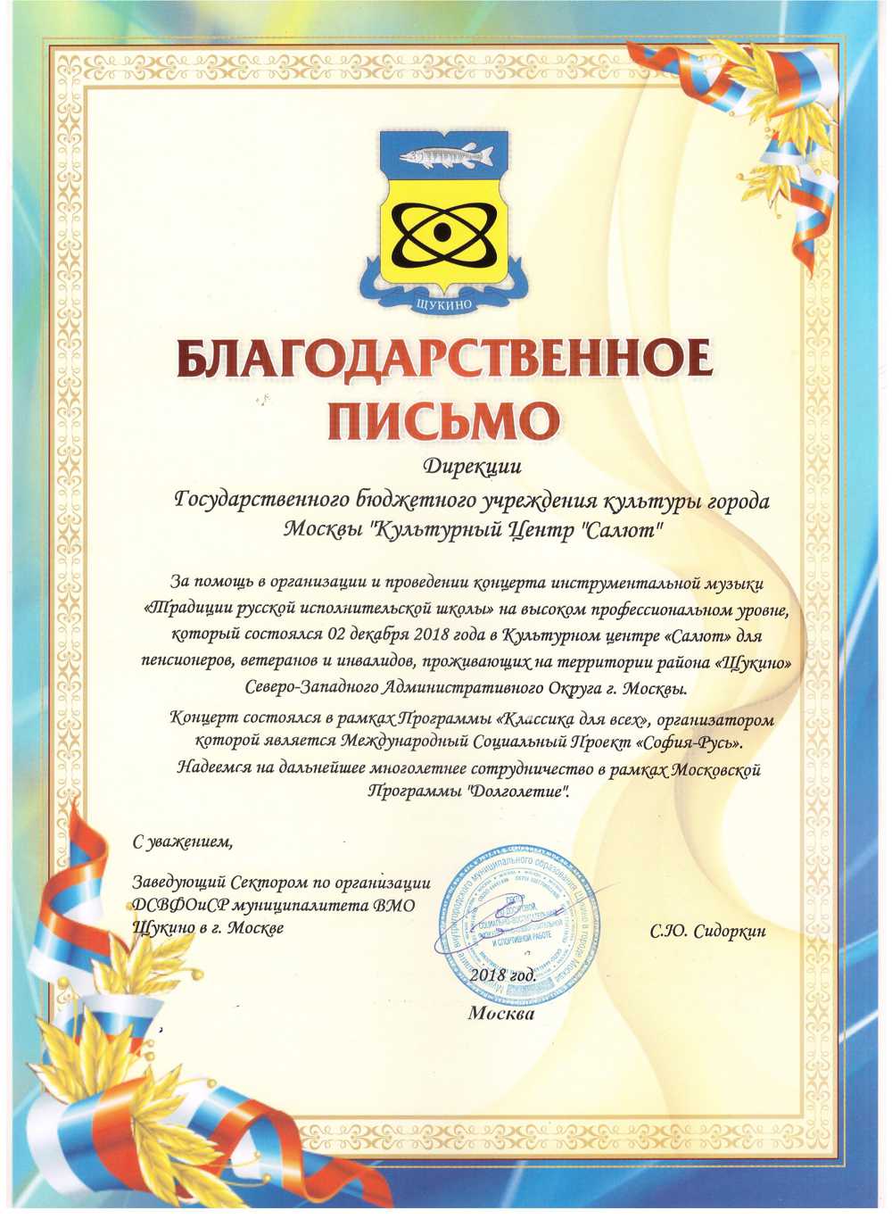 Организаторы Фестиваля культуры и Искусства «СОФИЯ — РУСЬ. ДИАЛОГ КУЛЬТУР» получили благодарственные письма от МОСКОВСКОЙ ГОРОДСКОЙ ДУМЫ.