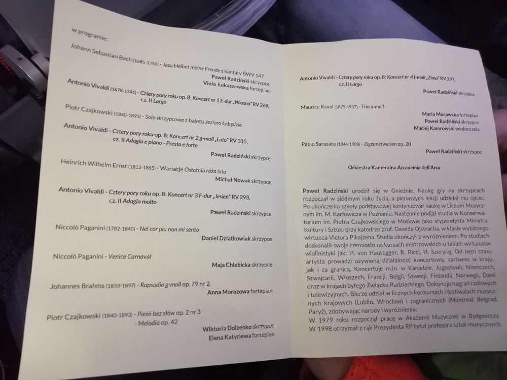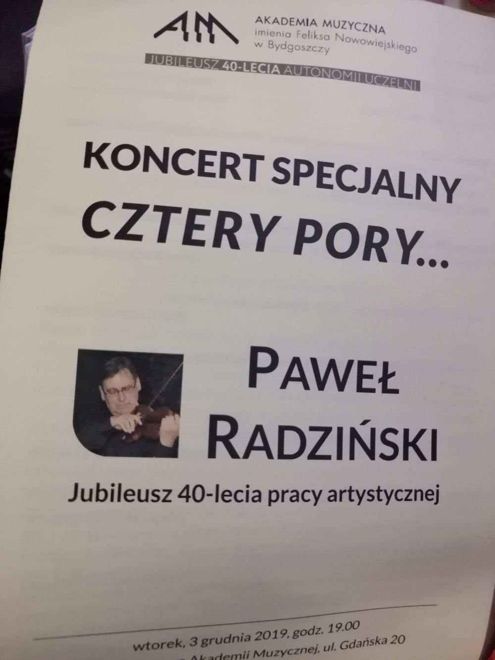 2 декабря 2019 года на Севере Польше - в г. Быгдоще , столице Куявско-Поморского воеводства, состоялся юбилейный концерт, посвященный 40-летию творческой деятельности Павла Радзинского (скрипача, профессора Музыкальной Академии им. Феликса Нововейского в Быдгоще (Польша), художественного руководителя оркестра «Accademia dell'Arco»).