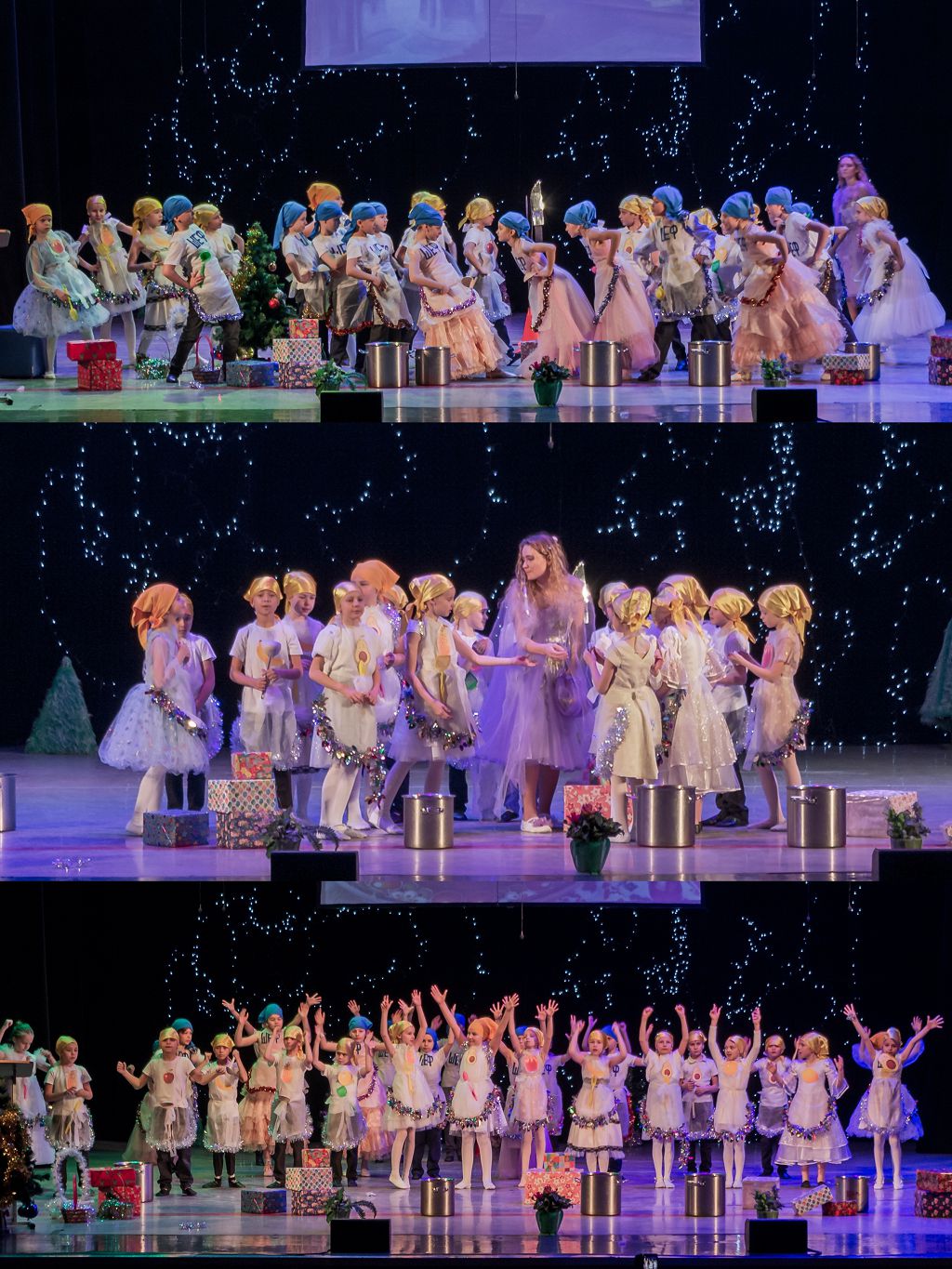Для чего же столько усилий, затрат энергии, сил, времени, средств? Чтобы поставить среди учебных будней, как бы между делом, вот такую сказку, в которой участвует вся школа, требуется ведь очень много времени и слаженной , напряженной работы всего коллектива. Проще всего этого не делать или делать по минимуму — раздать детям по классам стихи , потом почитать их под елкой, раздать детям подарки, сделать фотосессию с Дедом Морозом и Снегурочкой и попить тихо чаю с конфетами и пирогами по классам. Зачем нужен такой сложный, бурный процесс, в который вовлечена вся школа?