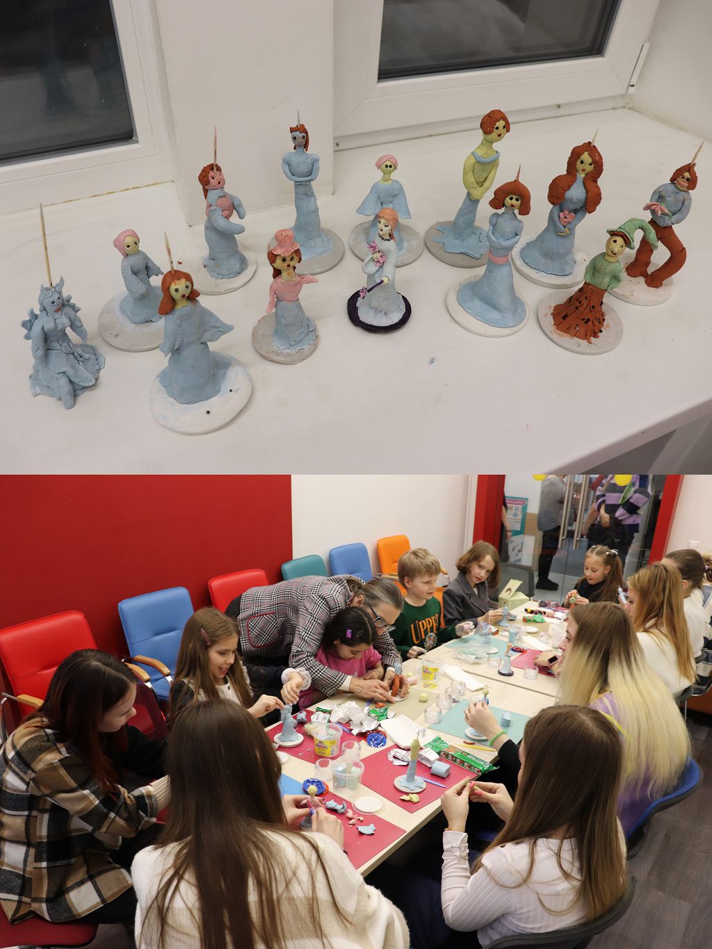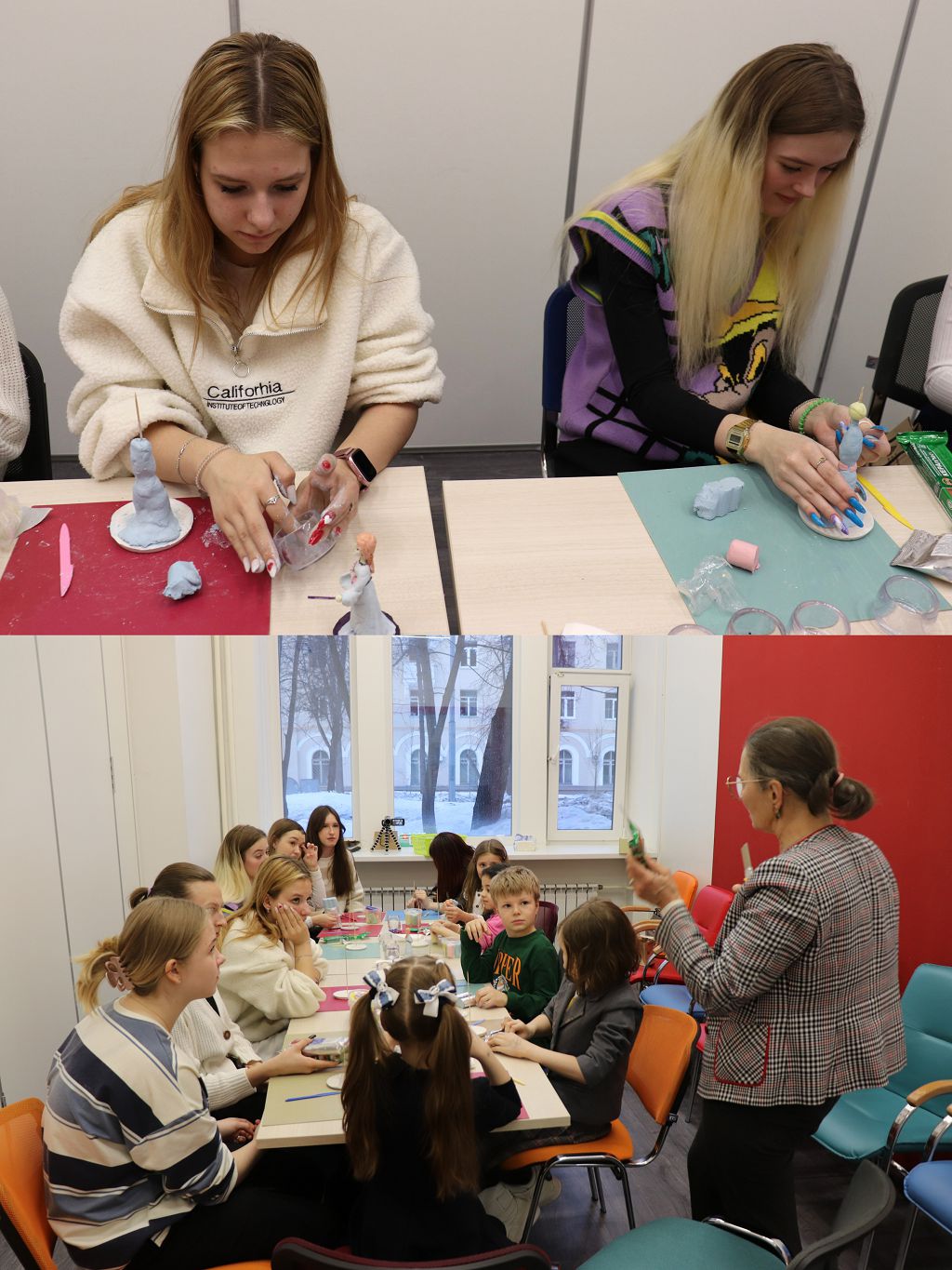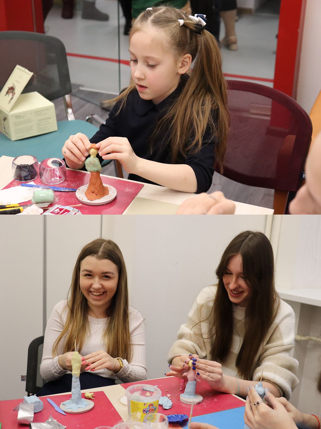 Еще один мастер-класс прошел по теме «Лепка», который провела Баклан Татьяна Евгеньевна, преподаватель технологии, студии керамики Школы «Морозко». Ребята, их родители и студенты с увлечением лепили из глины сказочных персонажей.