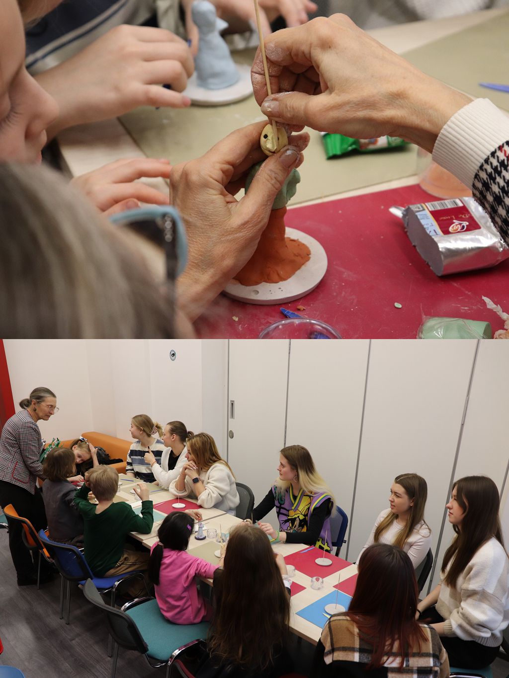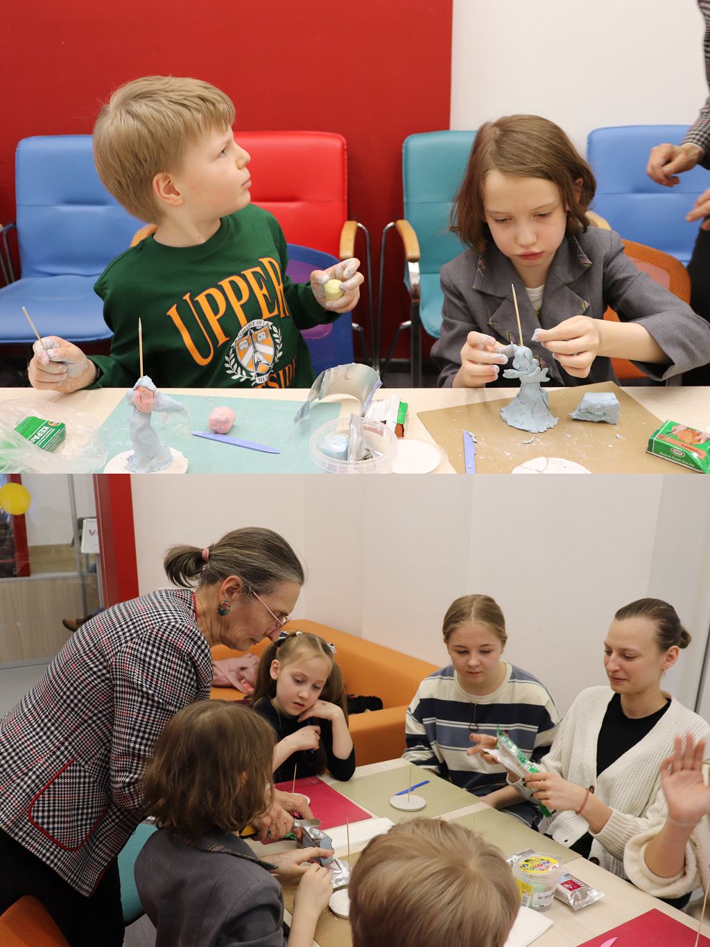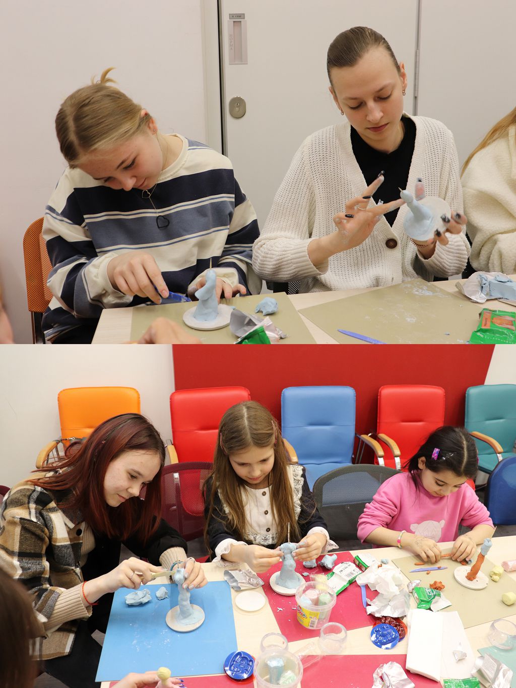 Еще один мастер-класс прошел по теме «Лепка», который провела Баклан Татьяна Евгеньевна, преподаватель технологии, студии керамики Школы «Морозко». Ребята, их родители и студенты с увлечением лепили из глины сказочных персонажей.