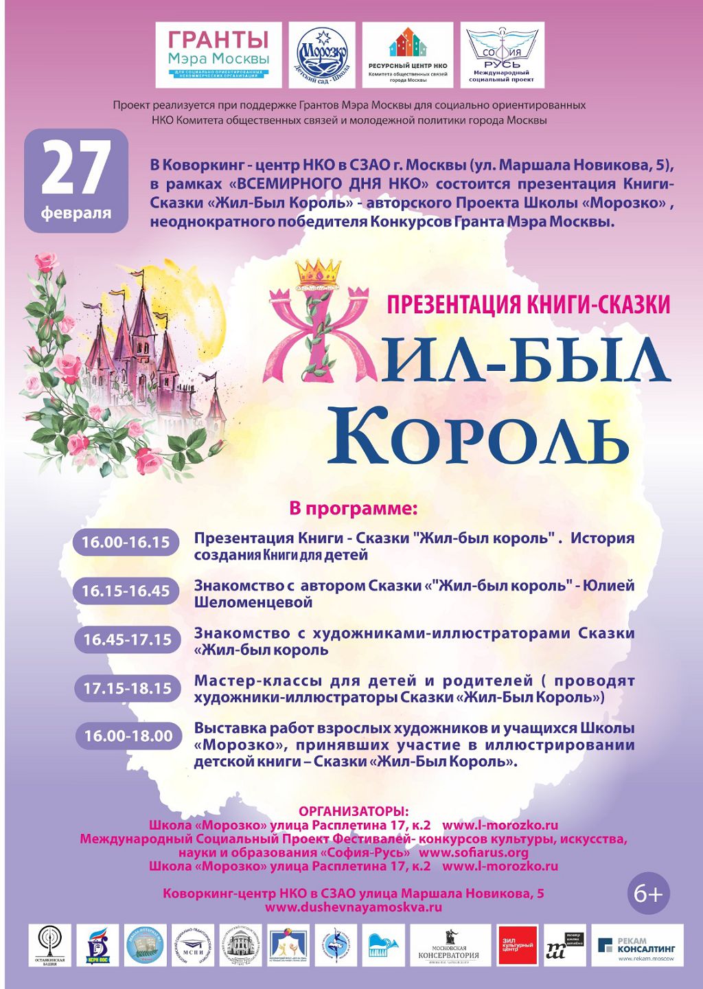 А в этом году Школа "Морозко" познакомила гостей праздника (школьников и их родителей, студентов, преподавателей) еще с одним своим авторским проектом - СКАЗКОЙ "Жил-был король". Уникальность проекта заключается в том, что иллюстрировали книгу вместе со взрослыми, профессиональными художниками дети - учащиеся школы " Морозко". В течение двух лет была проделана огромная работа и вот наконец книга вышла в свет и была представлена читательской аудитории. О том, как создавалась книга, гости узнали 27-го февраля на празднике «ВСЕМИРНЫЙ ДЕНЬ НКО» в коворкинг-центре НКО в СЗАО г. Москвы.