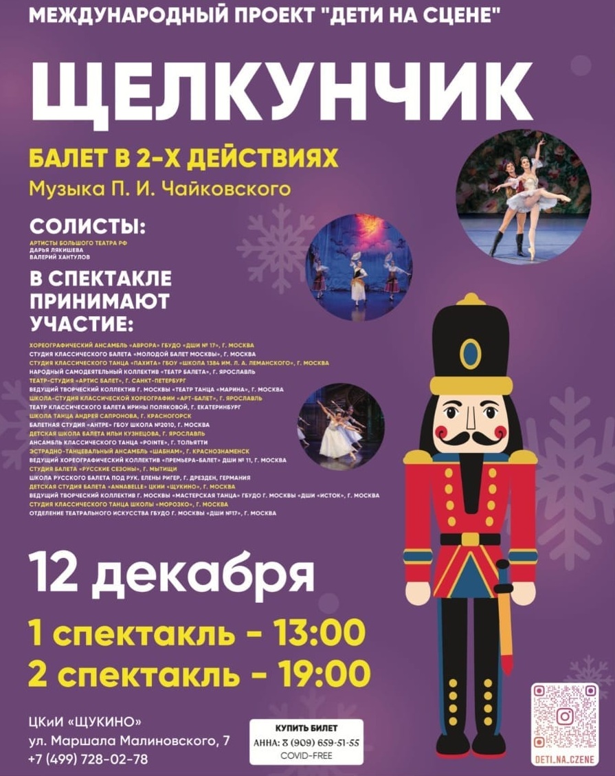 12 декабря в Культурном Центре "Щукино", в рамках Международного Проекта "Дети на сцене", состоялся балет "Щелкунчик", в котором выступили учащиеся Школы "Морозко", посещающие хореографическую студию на базе школы под руководством Лебединской Вероники Геннадьевны.
