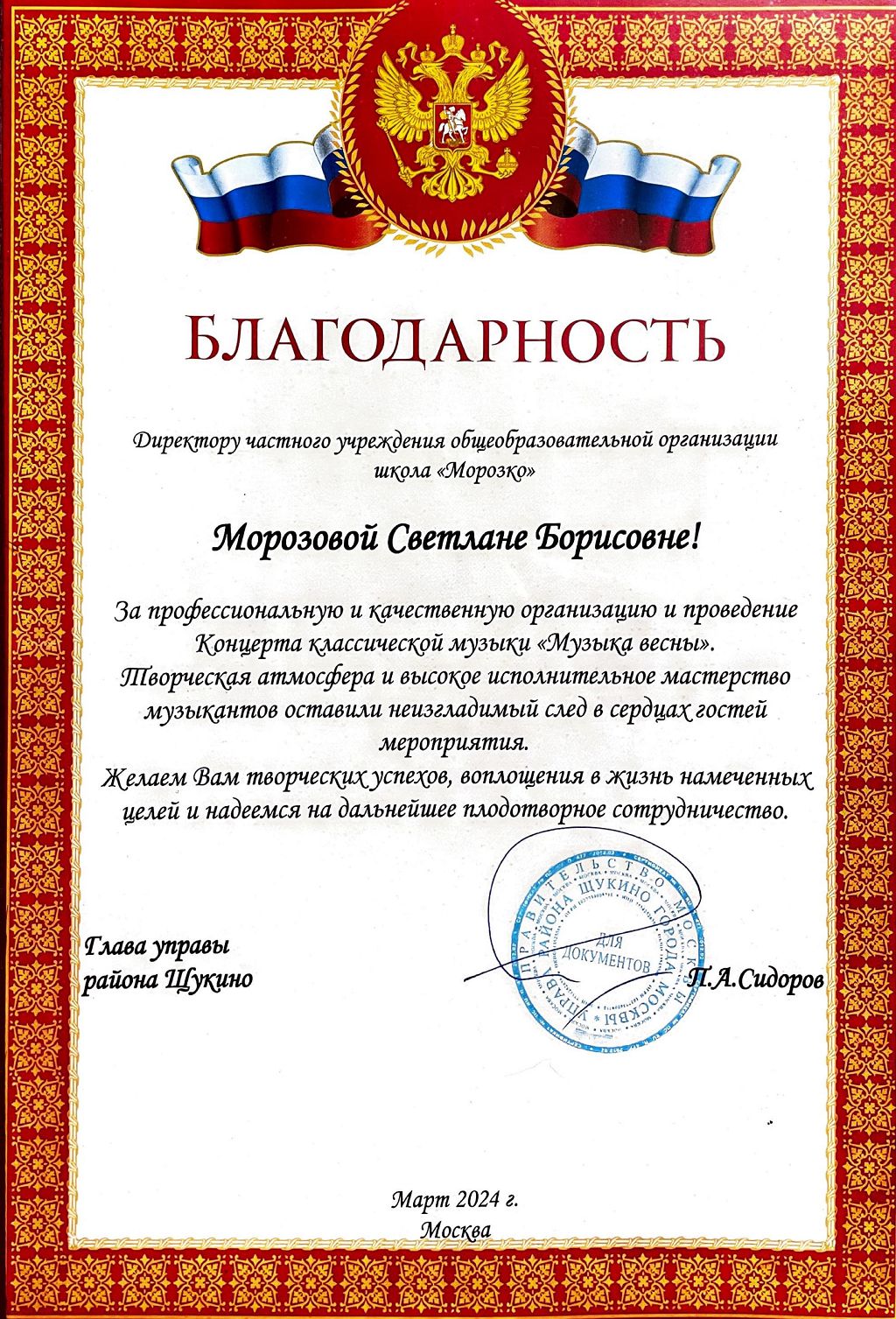 предоставил Морозовой Светлане Борисовне - директору Школы "Морозко", автору и учредителю Международного