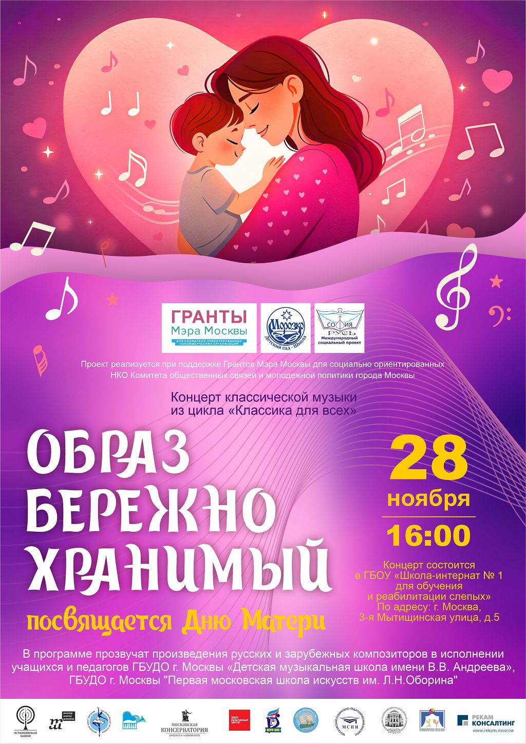 28 ноября 2024 года в ГБОУ «Школа-интернат №1 для обучения и реабилитации слепых" состоялся Концерт классической музыки из цикла «Классика для всех» - «ОБРАЗ БЕРЕЖНО ХРАНИМЫЙ». Мы уже не первый раз проводим подобные концерты в интернате для слепых и слабовидящих детей и отмечаем невероятную атмосферу тепла и очень внимательного прослушивания буквально каждого произведения, на которые учащиеся интерната очень эмоционально реагируют - так, как не реагируют порой "зрячие" - дети и взрослые, у которых нет никаких проблем со здоровьем и зрением. Наши юные музыканты очень любят играть в этом красивом, концертном зале интерната номер 1 для детской и подростковой аудитории, которая, наверное, лучше и тоньше, чем где-либо, воспринимает и слушает столь внимательно и трепетно классическую музыку, реагируя на то, что их особенно трогает, аплодисментами. Аплодисменты могут быть не только в конце, а в том месте произведения, которое наиболее растрогало детские сердца, когда возникло особенное эмоциональное переживание. Но подобная реакция никогда не мешает артистам, а наоборот - вдохновляет и даже помогает в исполнении, потому что артисты понимают, что их музыка имеет обратную связь, она не оставляет зрителя равнодушным. Зрители внимательно слушают, а это как раз и является очень важным для музыкантов.