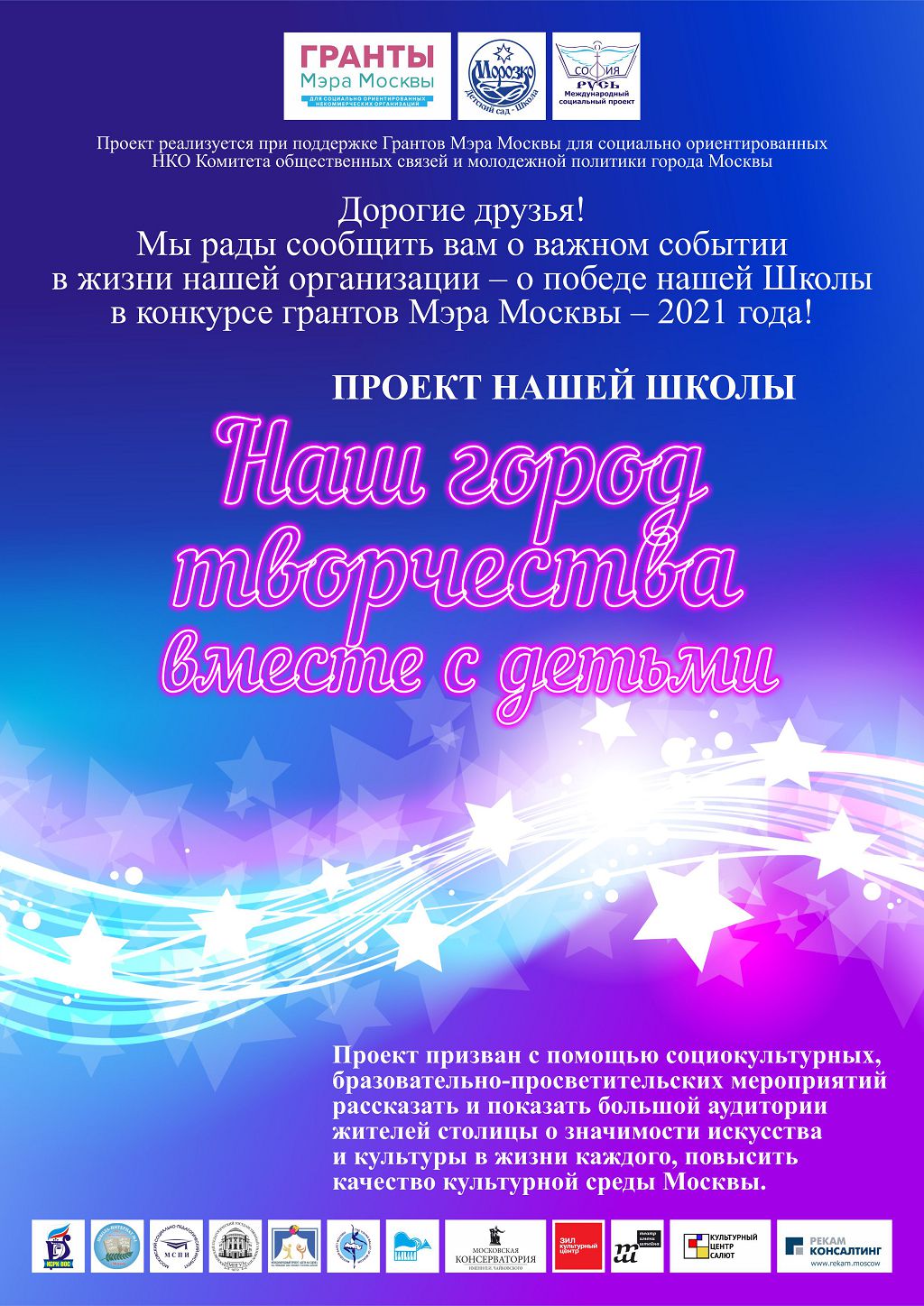 За получением гранта Мэра Москвы стоит многолетняя, кропотливая, вдумчивая деятельность Школы, направленная на социализацию, выявление и развитие творческого потенциала учащихся, которых Школа нацеливает на созидательную, творческую деятельность через участие в социально - значимых, культурных, образовательно-просветительских мероприятиях, что имеет огромное воспитательное значение.