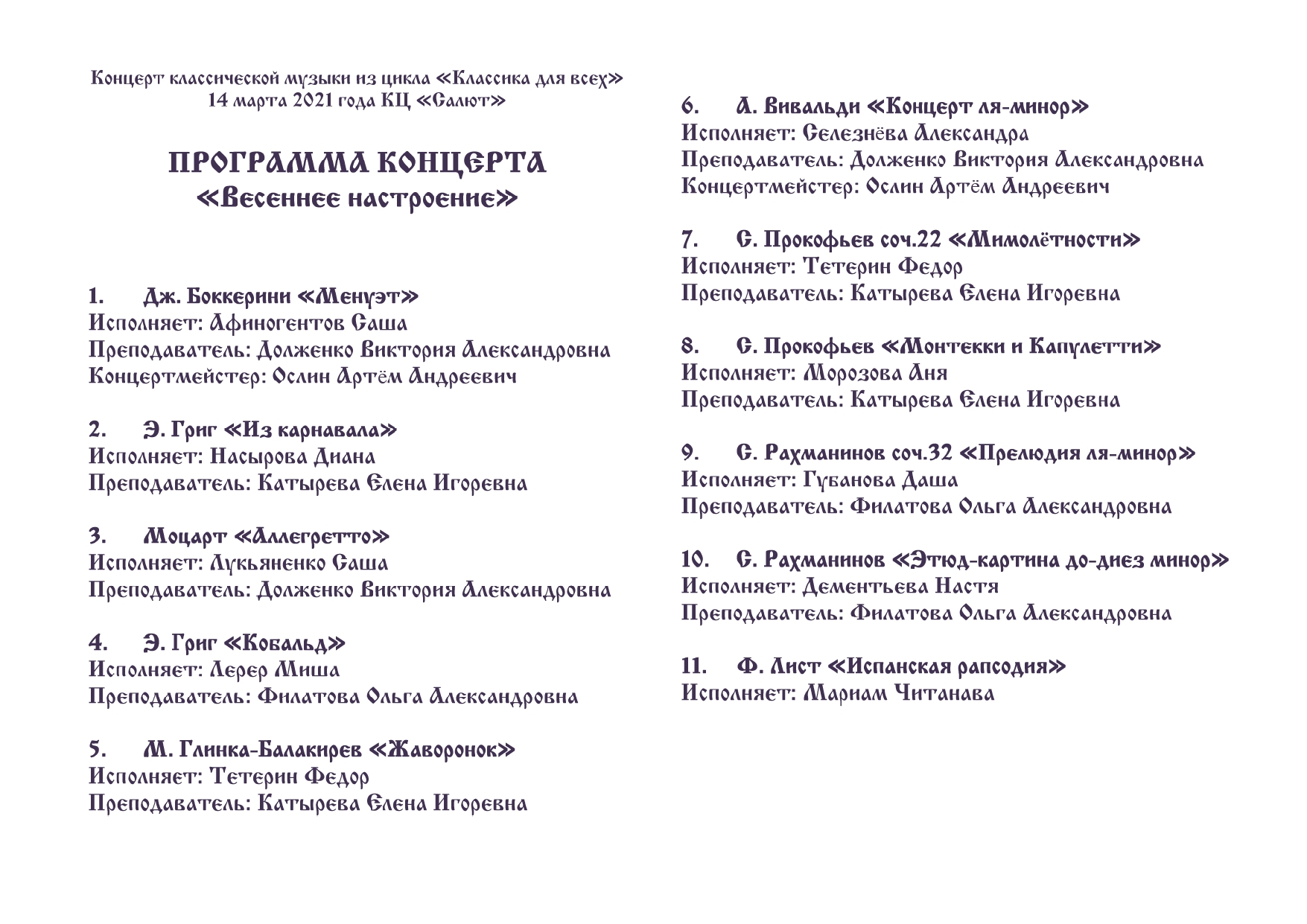 18 января 2020 года, в Культурном Центре «Салют», в рамках Проекта «Дети для детей города» состоялся концерт из цикла «Классика для всех»,