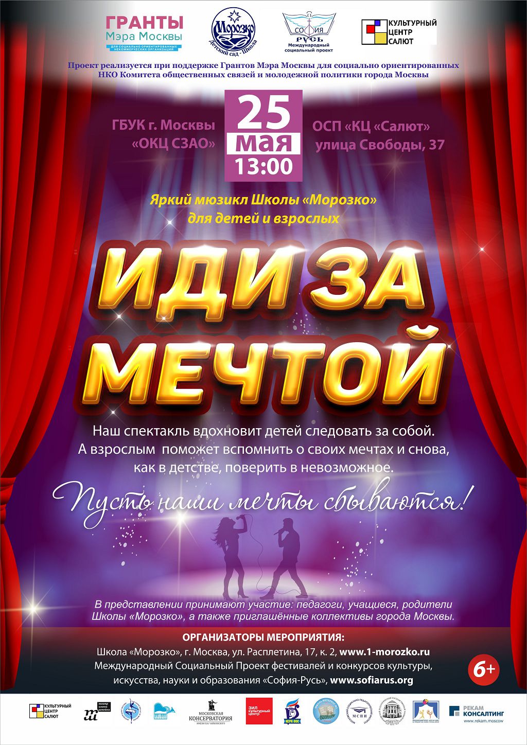 13:00-15:00 – на основной сцене КЦ «Салют» (зал «Восход») зрители увидели мюзикл Школы «Морозко» «Иди за мечтой». Невероятные приключения артистов из маленького городка, которые решили отправиться покорять сцены Мегаполиса... Но они даже представить себе не могли, насколько их путь к заветной мечте будет сложным и даже опасным! Как всегда наш мюзикл подарил много незабываемых впечатлений. Аттракцион музыкальных номеров, яркая игра артистов вдохновила детей следовать за собой. А взрослым наш спектакль помог вспомнить о своих мечтах юности и снова поверить в невозможное...