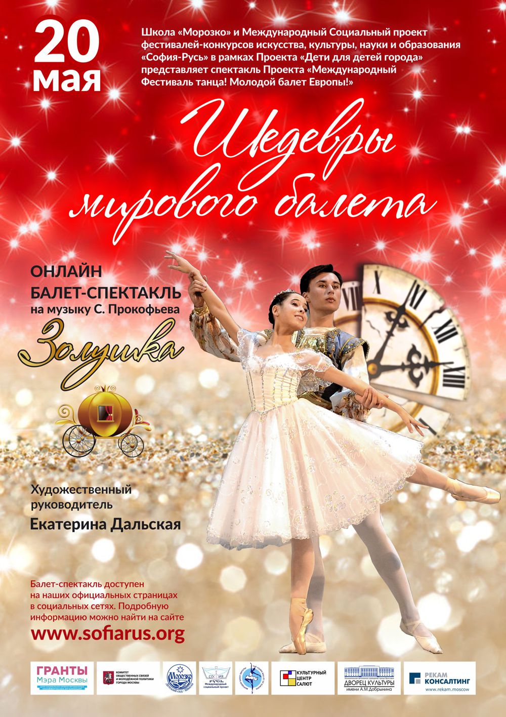 Школа «Морозко» и Международный Социальный Проект фестивалей-конкурсов культуры, искусства, науки и образования «София-Русь», в рамках Проекта «Дети для детей города», при поддержке Грантов Мэра Москвы, представляет вниманию балет-спектакль «Золушка» на музыку Сергея Прокофьева. В спектакле «Золушка» приняли участие хореографические коллективы-победители Фестиваля Танца «Молодой балет Европы».