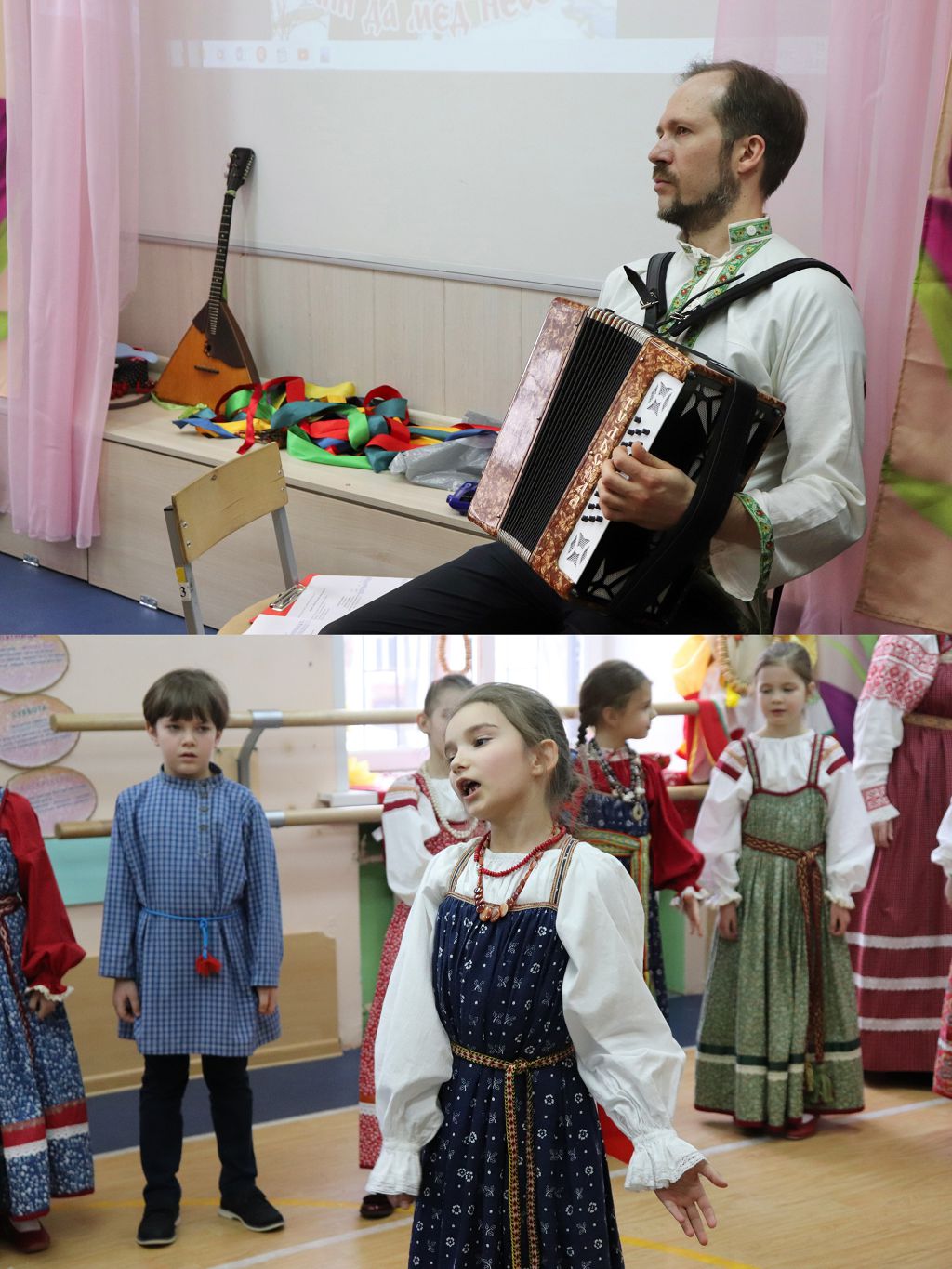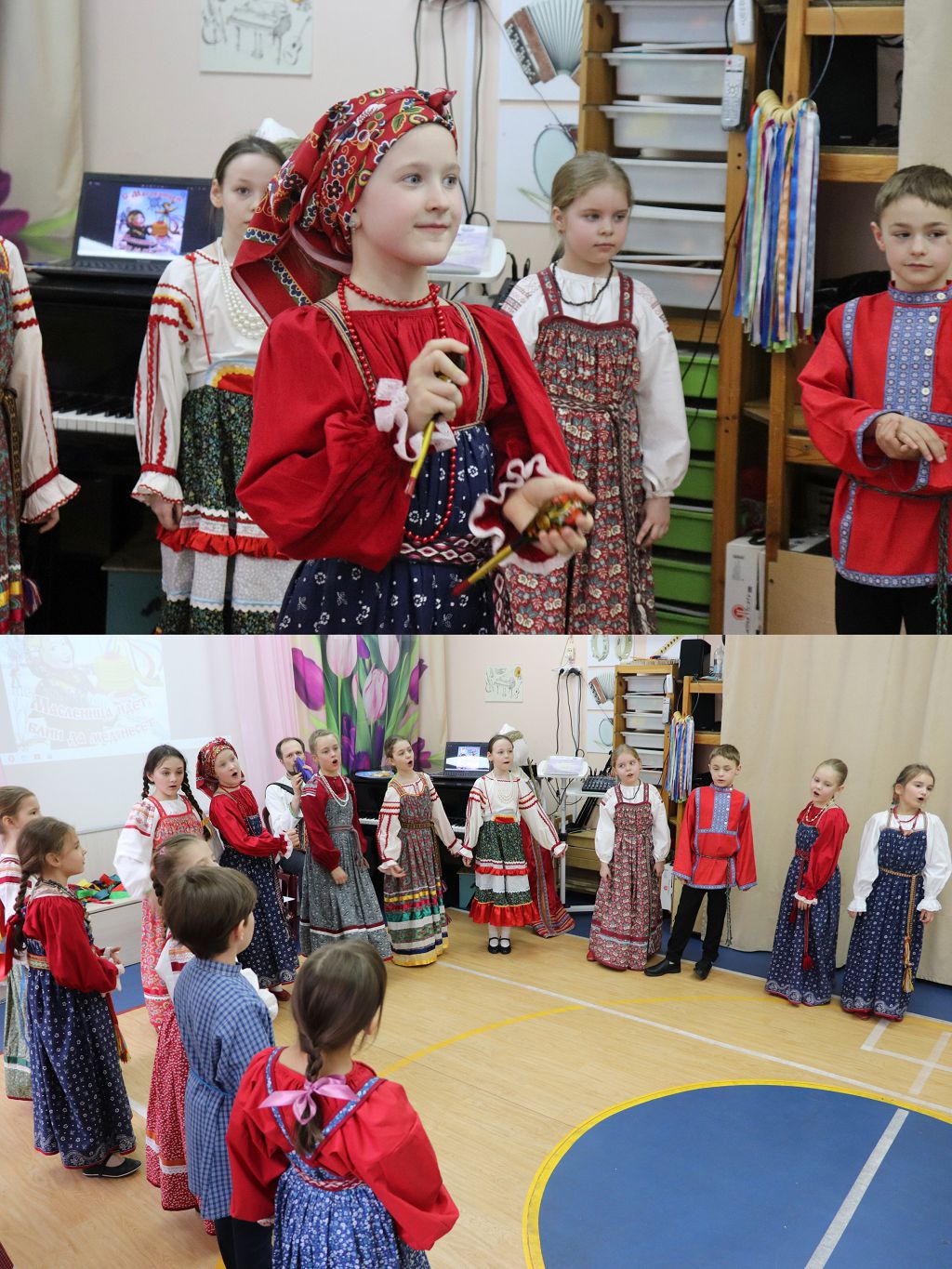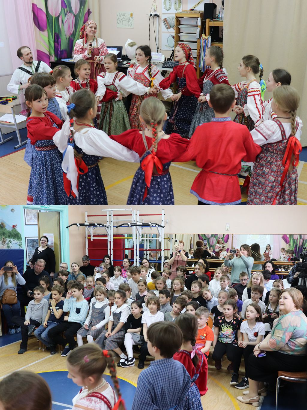 С обрядовыми песнями, плясками и играми наших ребят познакомили юные артисты фольклорного ансамбля «КАДРИЛЬ» из музыкальной школы им. В. В. Андреева. Концертная программа «Вокруг солнца» очень наглядно и ярко познакомила наших учащихся с народными фольклорными традициями, закличками и, конечно, играми-хороводами.