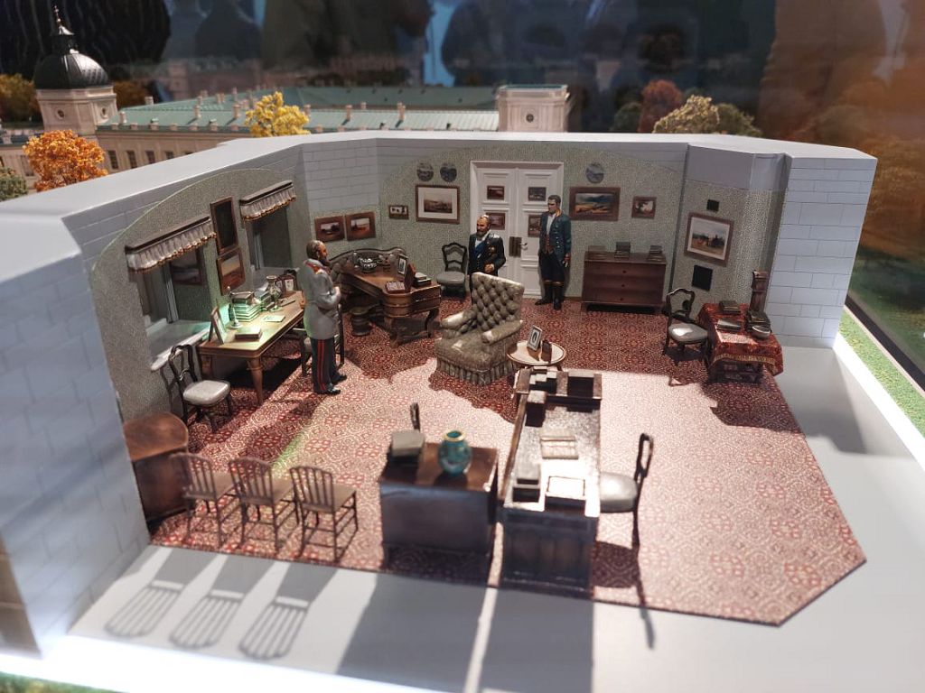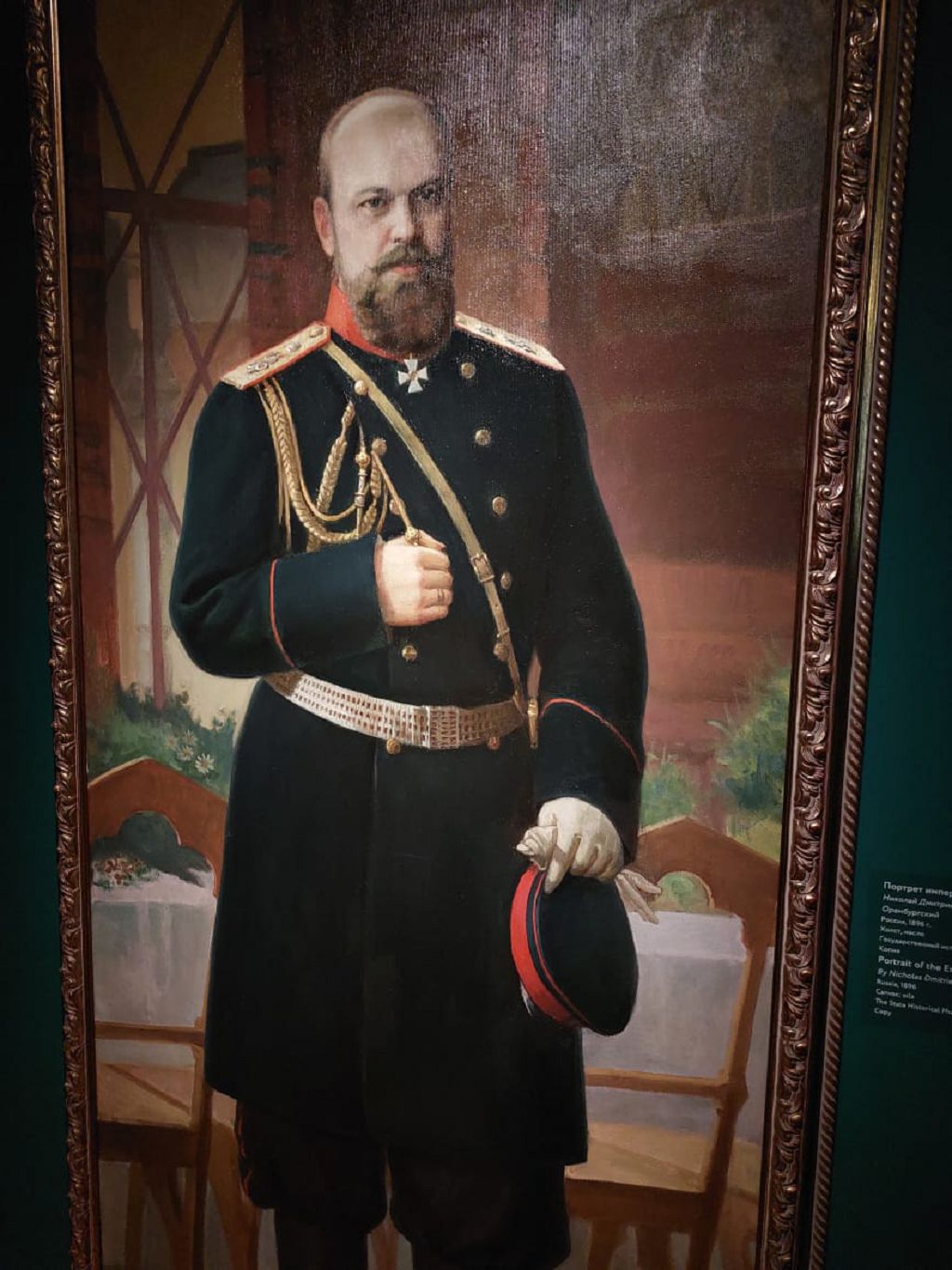 И наконец, зал, где император-победитель Александр I со своей армией в Париже...А далее — залы, где воссоздана эпоха еще одного императора, прекрасно сведущего в военном деле — Николая I…. Затем остается в памяти зал, где воссоздан макет необыкновенного по своей красоте и размаху дворца и при этом достаточно скромный личный кабинет императора Александра III… И наконец, трагичные картины, которые воспроизводят события 1-ой мировой войны, последний российский император Николай II производит смотр войск и рядом с ним не только его генералы , но и его семья — супруга, дети...