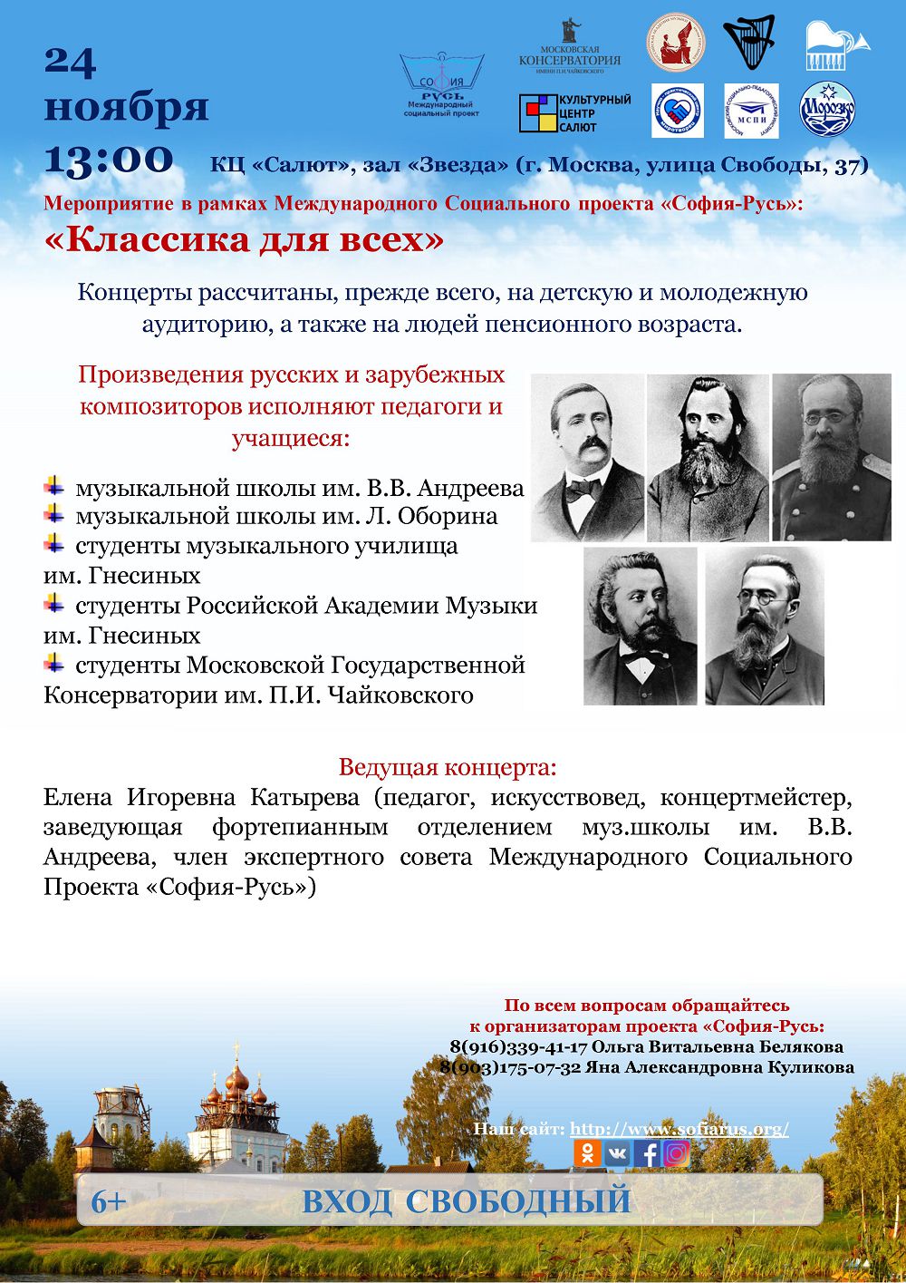 В рамках Международного Социального Проекта «София-Русь», нацеленного на объединение творческих людей самого разного возраста, проводятся не только конкурсы по различных направлениям искусства, культуры, науки и образования. Организуются творческие вечера и встречи с интересными людьми, известными деятелями науки, искусства и культуры, проводятся благотворительные акции и мероприятия, праздники различной тематики для инвалидов, детей из многодетных и социально незащищенных семей. Наш проект занимается просветительской деятельностью. Уже стало традицией проводить музыкальные гостиные, концерты классической и народной музыки. С 2017 года мы организовали цикл музыкальных вечеров «КЛАССИКА ДЛЯ ВСЕХ».