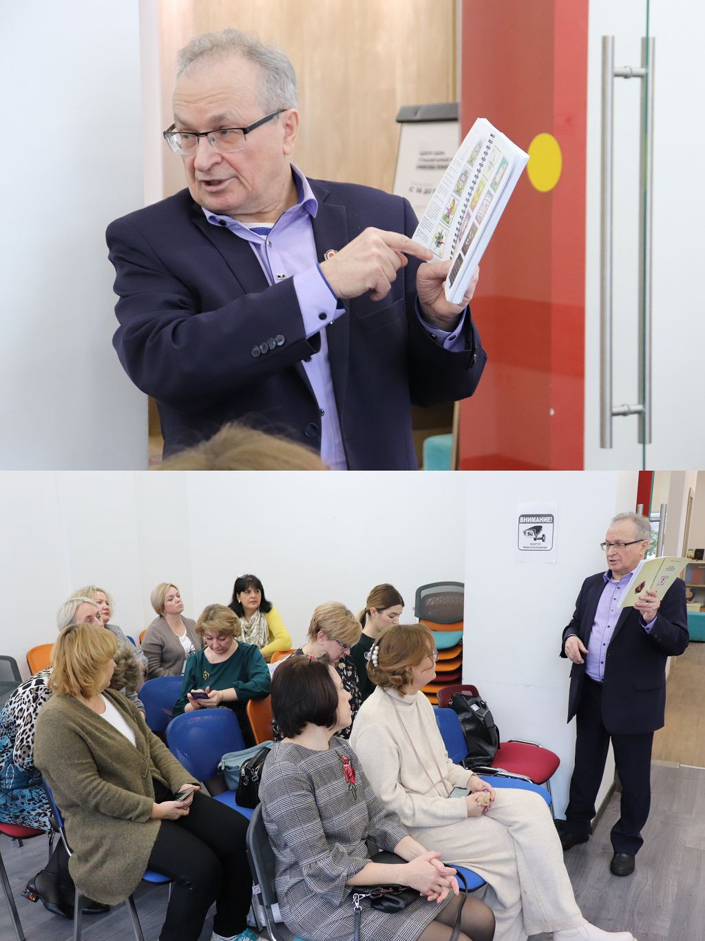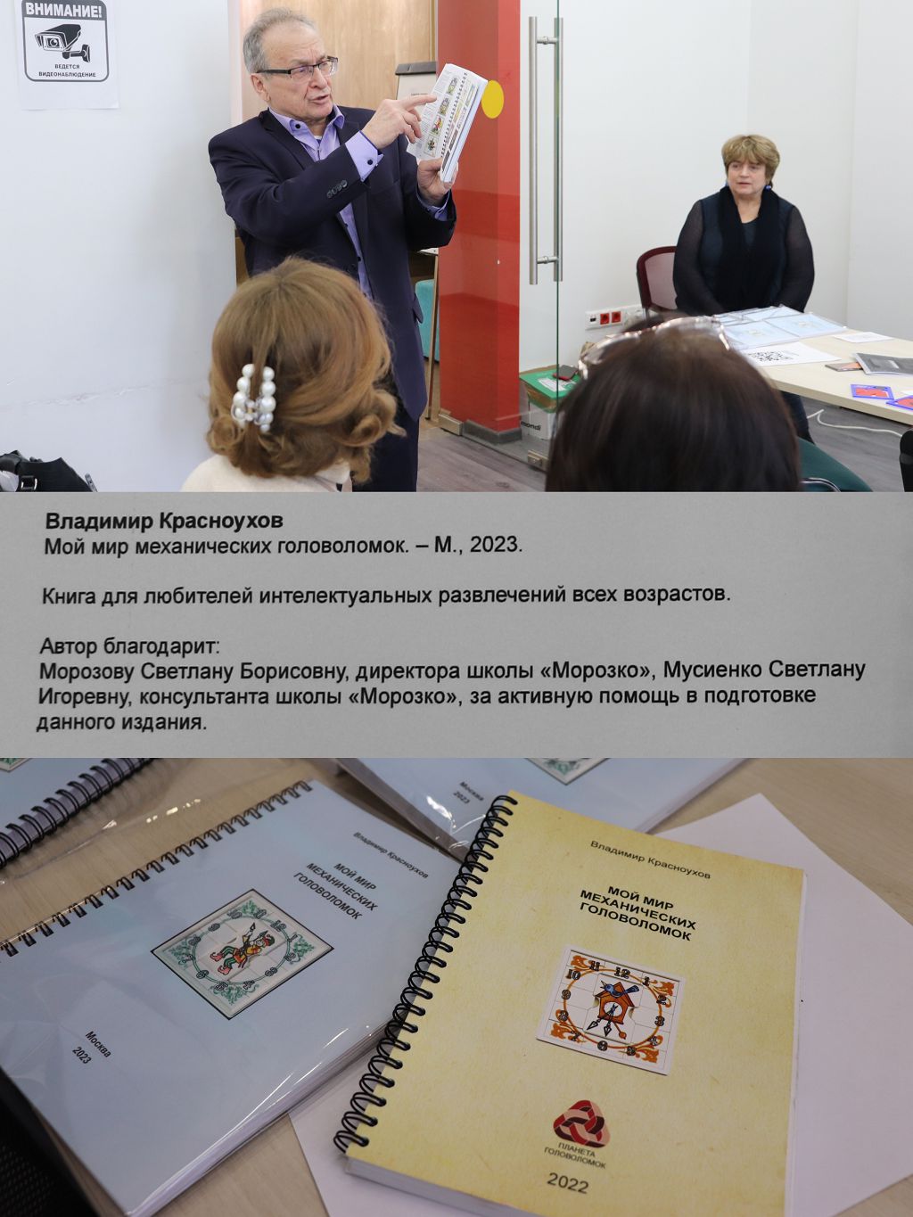 В 12:00 начал свою работу лекторий «Мир головоломок», который провел интересный человек, изобретатель, кандидат технических наук, почетный член Всероссийского общества изобретателей и рационализаторов, обладатель более 40 патентов на изобретения Красноухов Владимир Иванович. Он рассказал, как благодаря играм-головоломкам развивать творческие и умственные способности взрослых и детей. Слушатели познакомились с разными видами головоломок, а также со способами, правилами и алгоритмами их решений и смогли поучаствовать в презентации уникальной книги В.Красноухова «Мой мир механических головоломок». Владимир Иванович рассказал и показал свои наиболее интересные головоломки. Гости смогли внимательно рассмотреть и разгадать наиболее понравившиеся им головоломки.