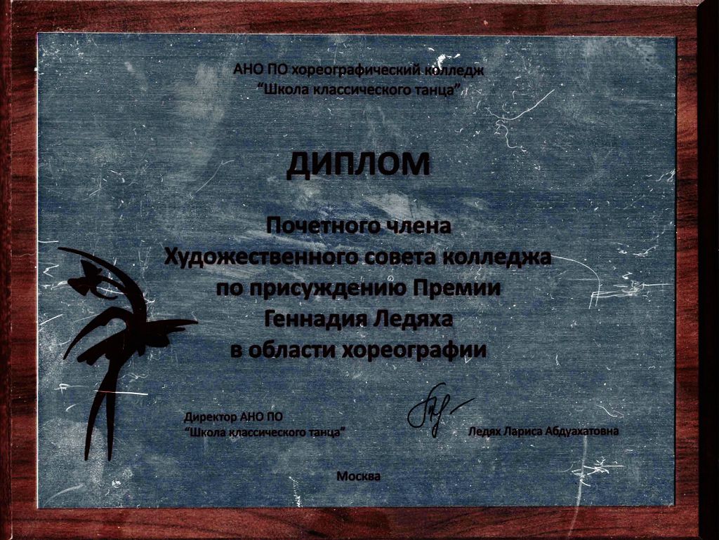 Но самым важным событием вечера памяти Г.В.Ледях стала присуждение высокой награды — медали «За заслуги перед отечеством» 2 степени. Указом Президента Российской Федерации художественному руководителю «Детского балетного театра» Культурного центра ЗИЛ присуждена эта высокая награда. Вручение награды должно было состояться на сцене Большого театра в прошлом году, но в силу сложившихся обстоятельств награждение не состоялось. 31 марта 2021 г. государственную награду супруге Геннадия Васильевича Ларисе Абдуахатовне Ледях вручил министр Правительства Москвы, руководитель Департамента культуры города Москвы Александр Владимирович Кибовский, сказав прекрасные слова об уникальности профессии артиста балета и в адрес основателя школы — Геннадия Васильевича Ледях, который в 1992 году на базе Детского балетного театра Дворца культуры ЗИЛ создал хореографический колледж «Школа классического танца» (учреждение среднего профессионального образования). Геннадием Васильевичем создана поистине уникальная структура непрерывного хореографического образования и воспитания детей от 4-х до 18 лет: Детский балетный театр – хореографический колледж «Школа классического танца», которая имеет широкую известность и признание не только в России, но и в других странах мира.